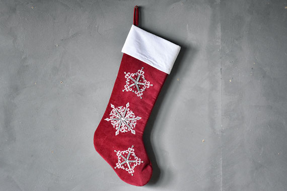 Julestrømpe – Rød velour med broderi, kommer med en praktisk hempe, slik at du enkelt kan henge den opp. Tips, broder inn navnet på strømpen så har alle i huset hver sin julestrømpe.