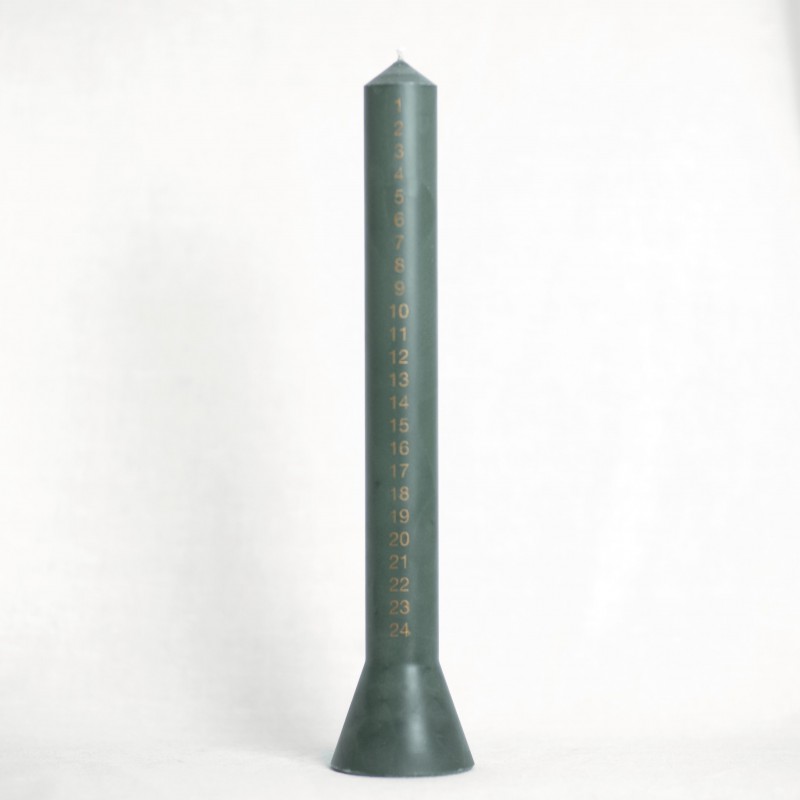 Kalenderlyset med 1-24 grønn, med messing tall, håndstøpes av 100 % vegetabilsk stearin og bivoks. Stearinen og den rette temperaturen under støpingen, skaper en marmorering, struktur i overflaten av lyset. Så hvert lys er unikt. Lysene brenner jevnt, kan stå uten noe underlag og oser ikke.