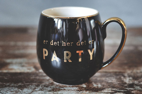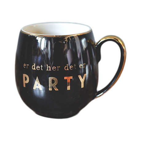 Dekorativ kopp i sort med gull trykk «er det her det er PARTY», tåler oppvaskemarskin.