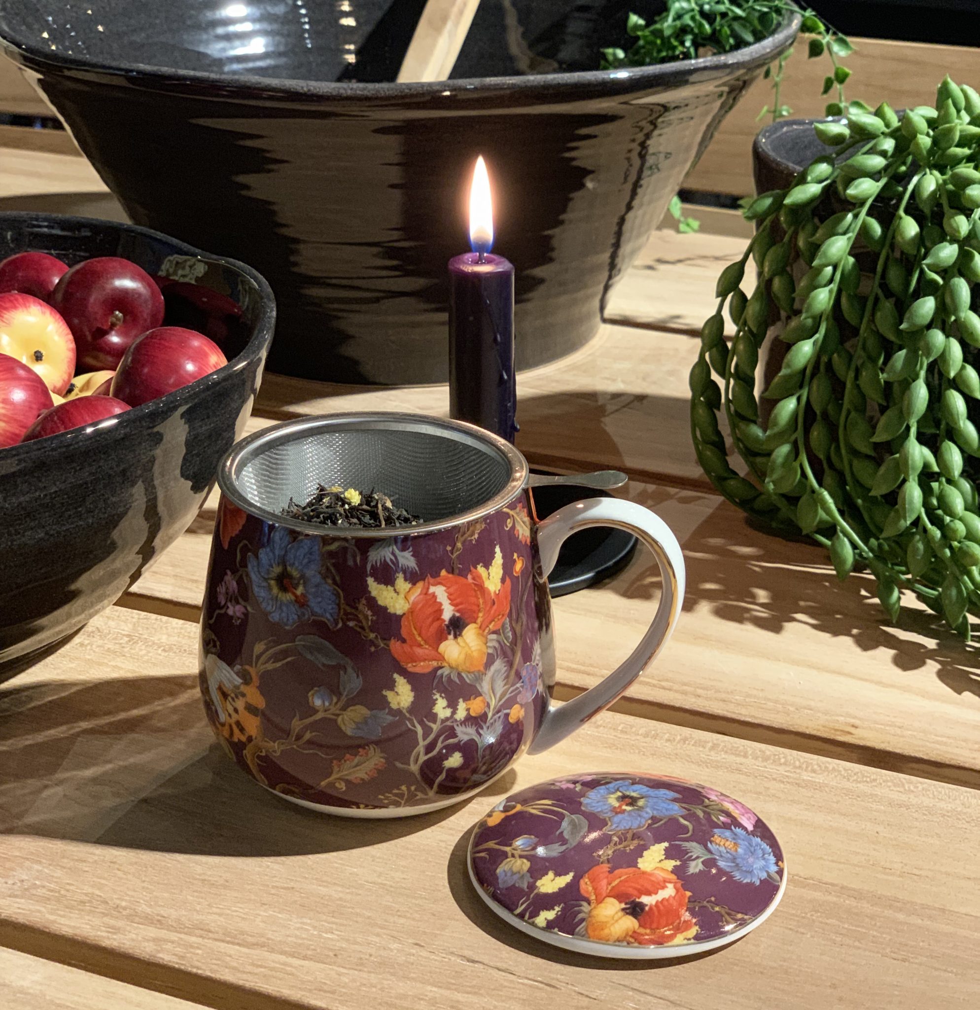 Dekorativ tekopp med botanisk mønster, har lokk og integrert tesil,  tåler oppvaskemarskin.