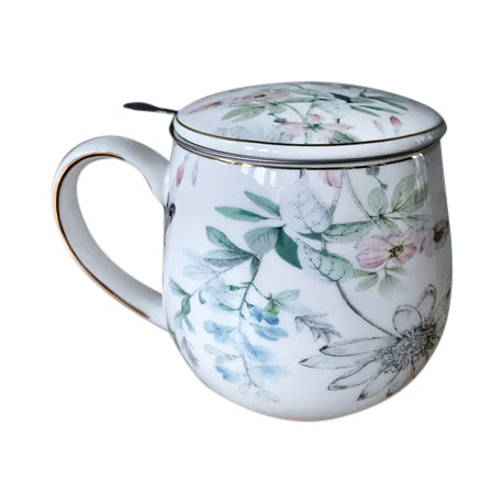 Dekorativ tekopp med fargerikt mønster, har lokk og integrert tesil,  tåler oppvaskemarskin.