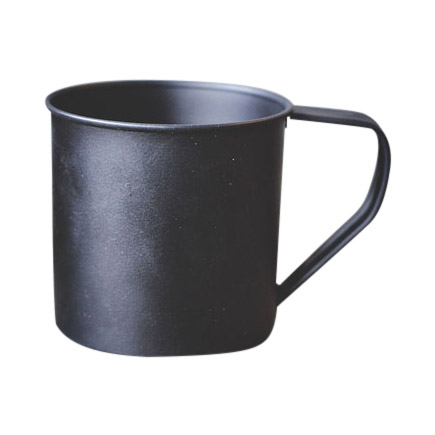 Stilren sort kopp i emalje, kan vaskes i oppvaskemarskin.