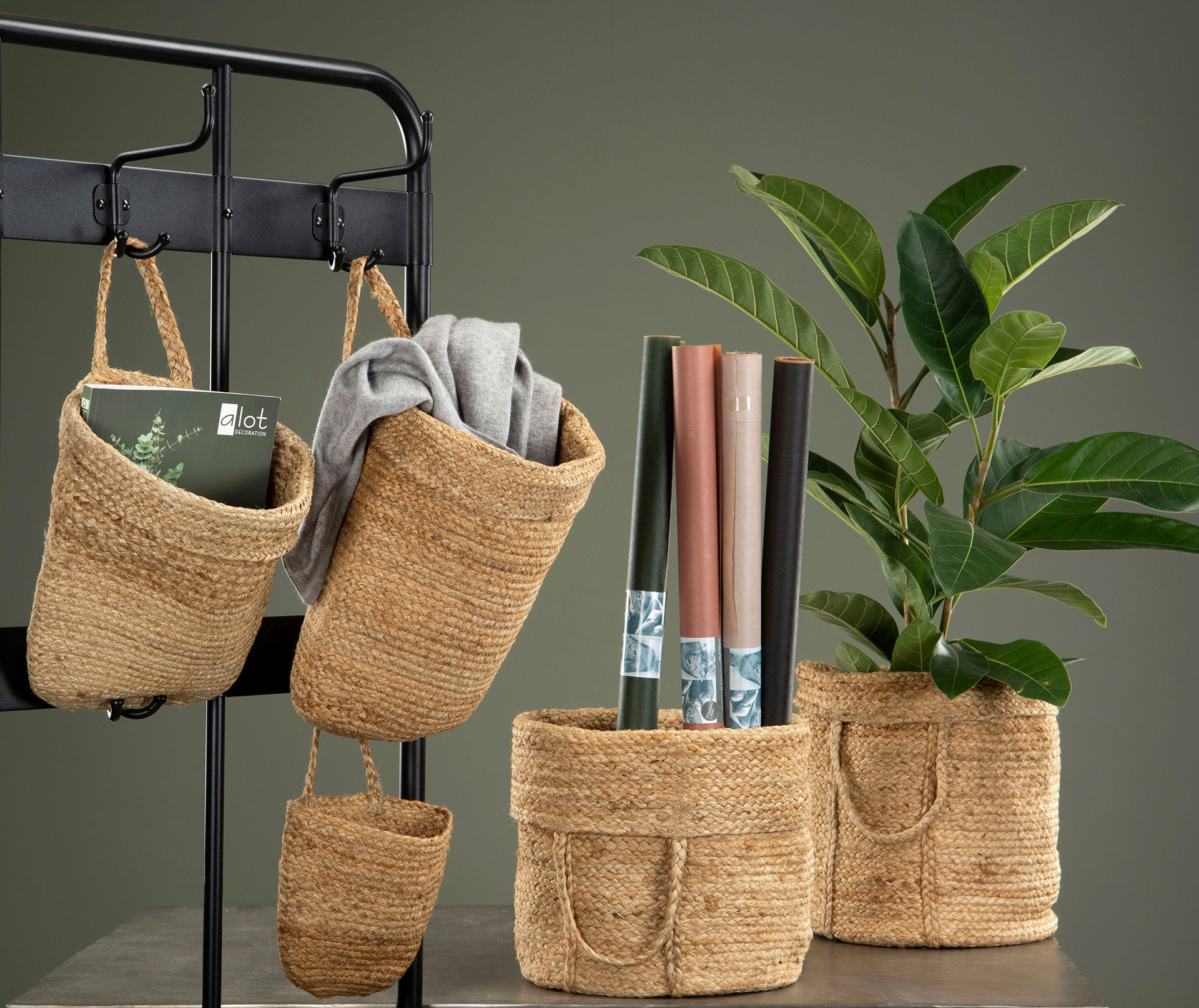 Kurven er laget av flettet jute. Med sitt naturlige materiale er kurven et velkomment tillegg til kjøkkenet, stuen eller badet som en balanse mellom metall, marmor og andre materialer.