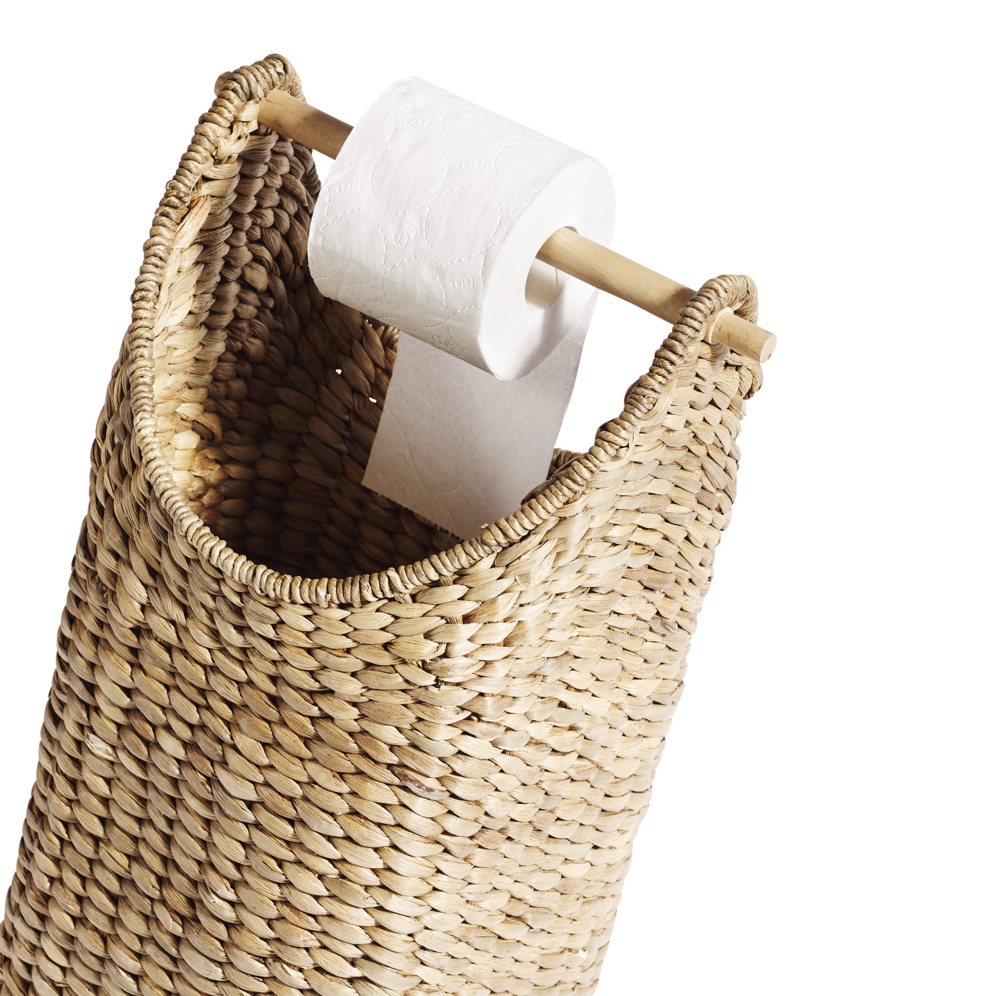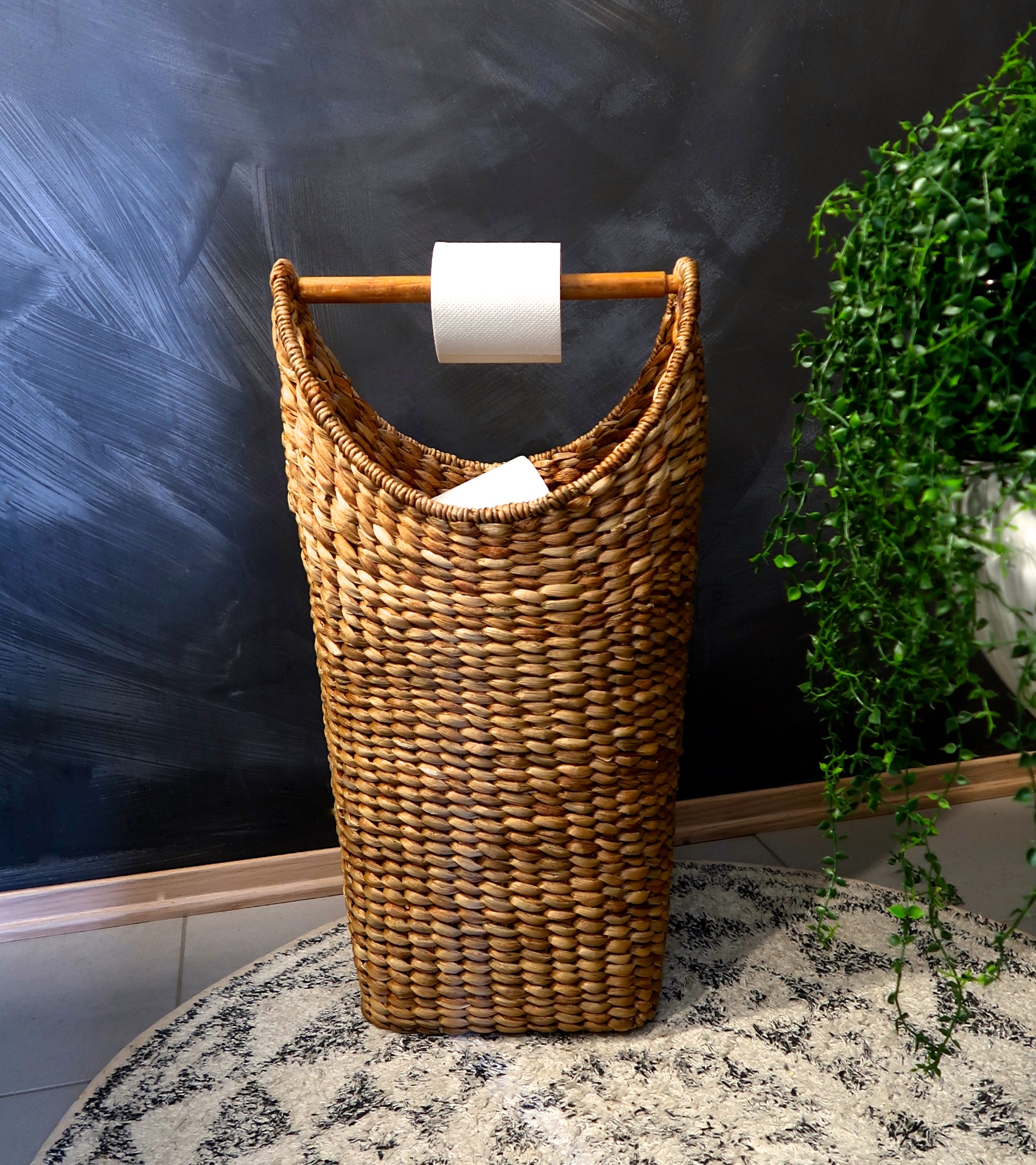 Dekorativ kurv i flettet vannhyasint. Passer perfekt til toalettpapir, du har plass til ca 16 ruller + 1 stk på trepinnen, her sparer du mye skap-plass og du slipper å lage noe hull i veggen!