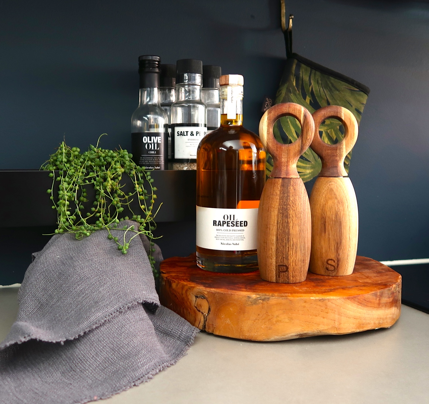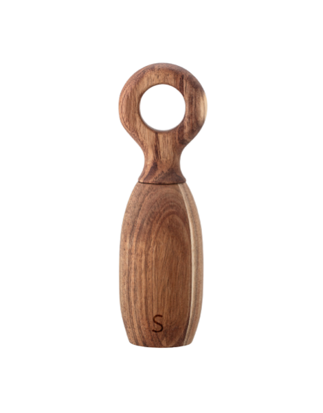 Dekorativ kvern til salt laget i treverk, akacie. Bokstaven S er preget inn i kvernen på den ene siden.