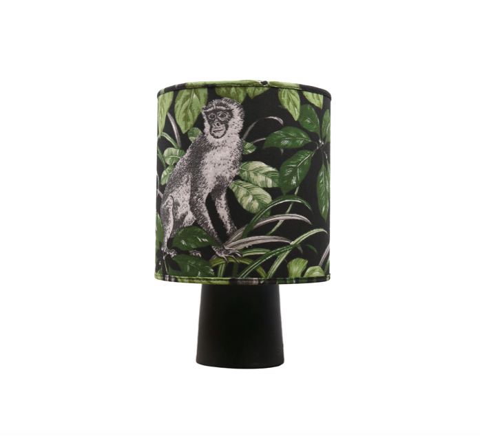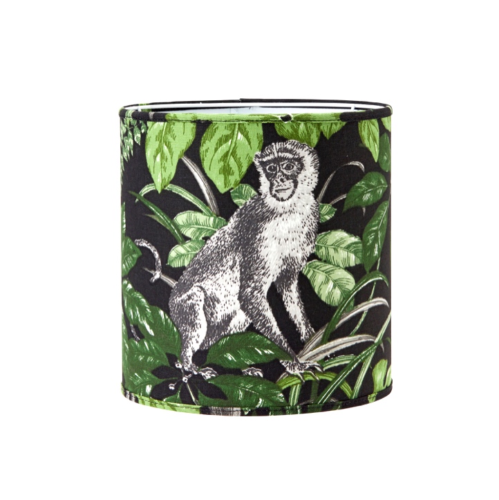 Dekorativ lampeskjerm med tropisk mønster av palmer og apekatter.