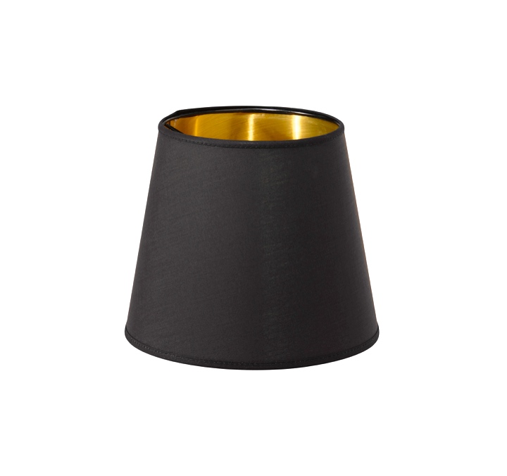 Dekorativ lampeskjerm med sort og innsiden i blank, gull. Lampeskjermen festes/settes på selve lyspæren, ikke lampefoten!