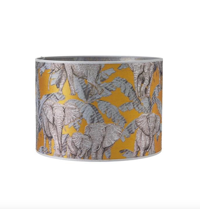 Dekorativ lampeskjerm med tropisk mønster av palmer og elefanter.
