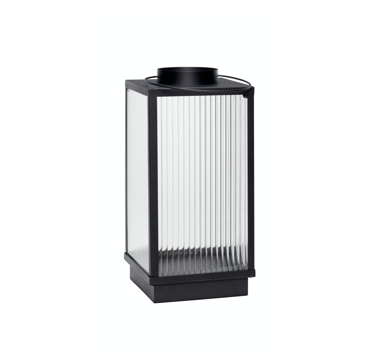 Dekorativt og elegant lykt i matt sort, kommer med rillet glass som skapet et eksklusivt uttrykk.