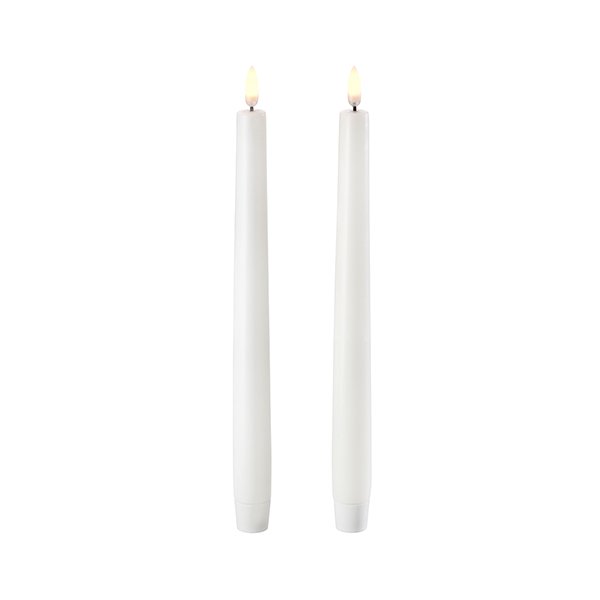 LED-kronelys i voks med livaktig 3D flamme, med bevegelse. Du får all stemningen som et ekte stearinlys skaper, uten noen av de skadelige kjemikaliene som frigjøres ved vanlig bruk av vokslys. Flammen kan du stille inn på forskjellige lysstyrker via fjernkontrollen. Her styrer du også timingen og av/på av lysene.