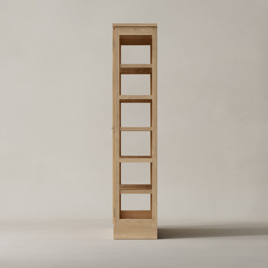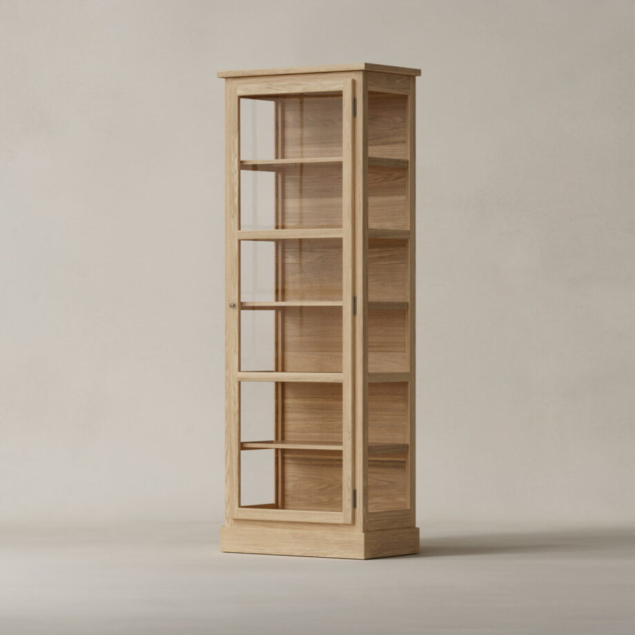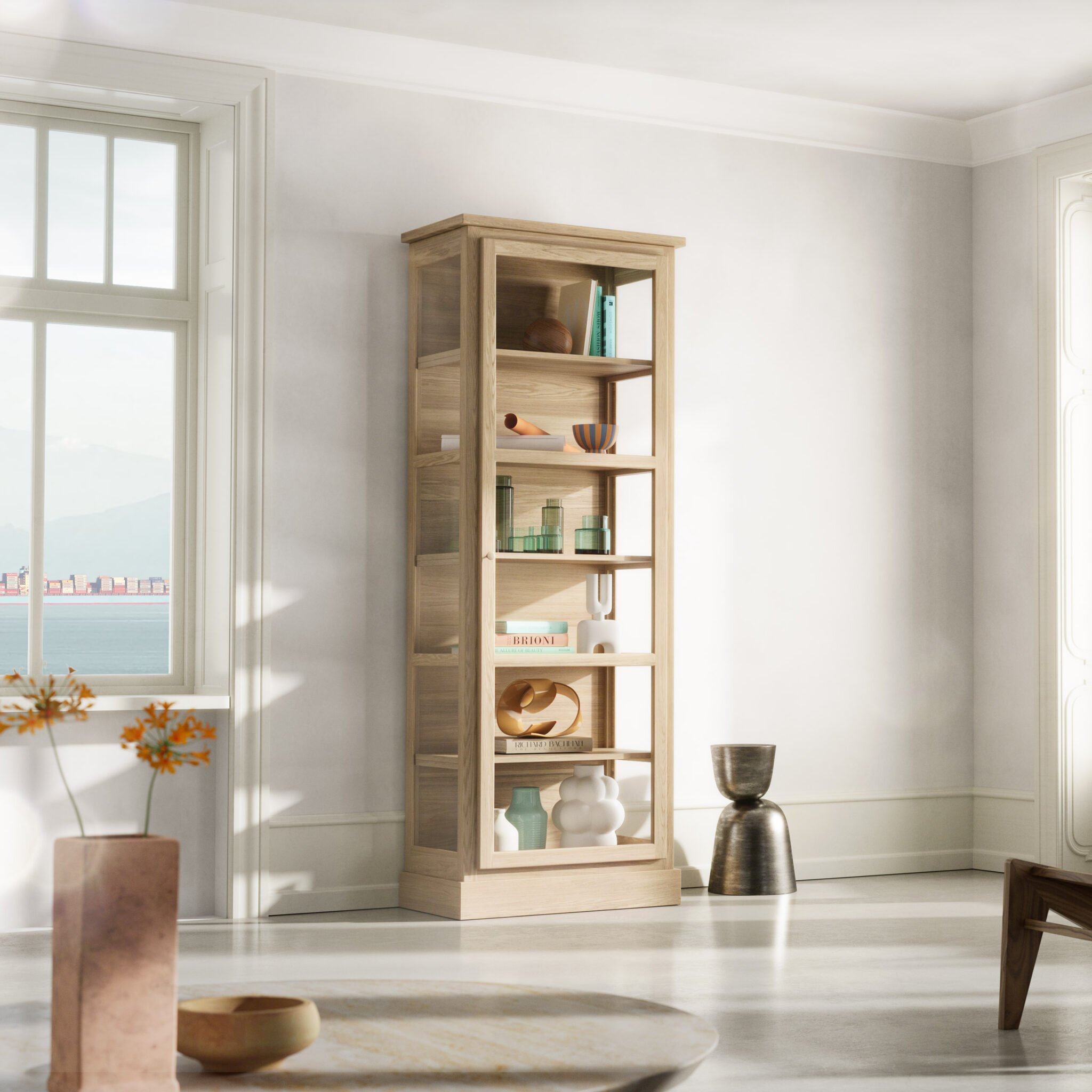 Vitrineskapet Oak er laget av massiv eik. Resultatet er en tekstur og varme som lar den delikate trestrukturen komme frem. Modell N2 Oak er ett høytstående skap med en dør, designet med en forenklet toppprofil og messinghengsler og håndtak.