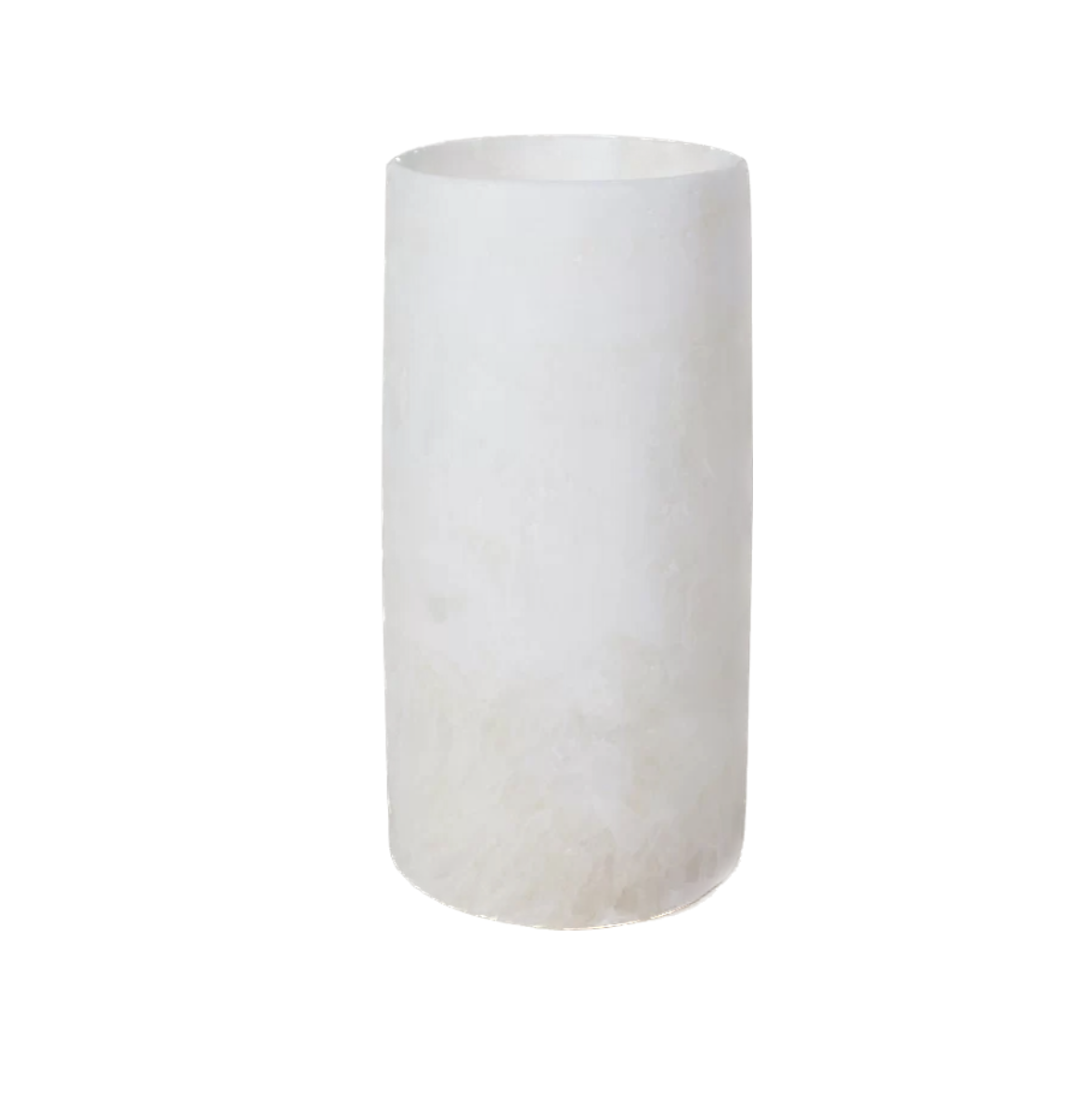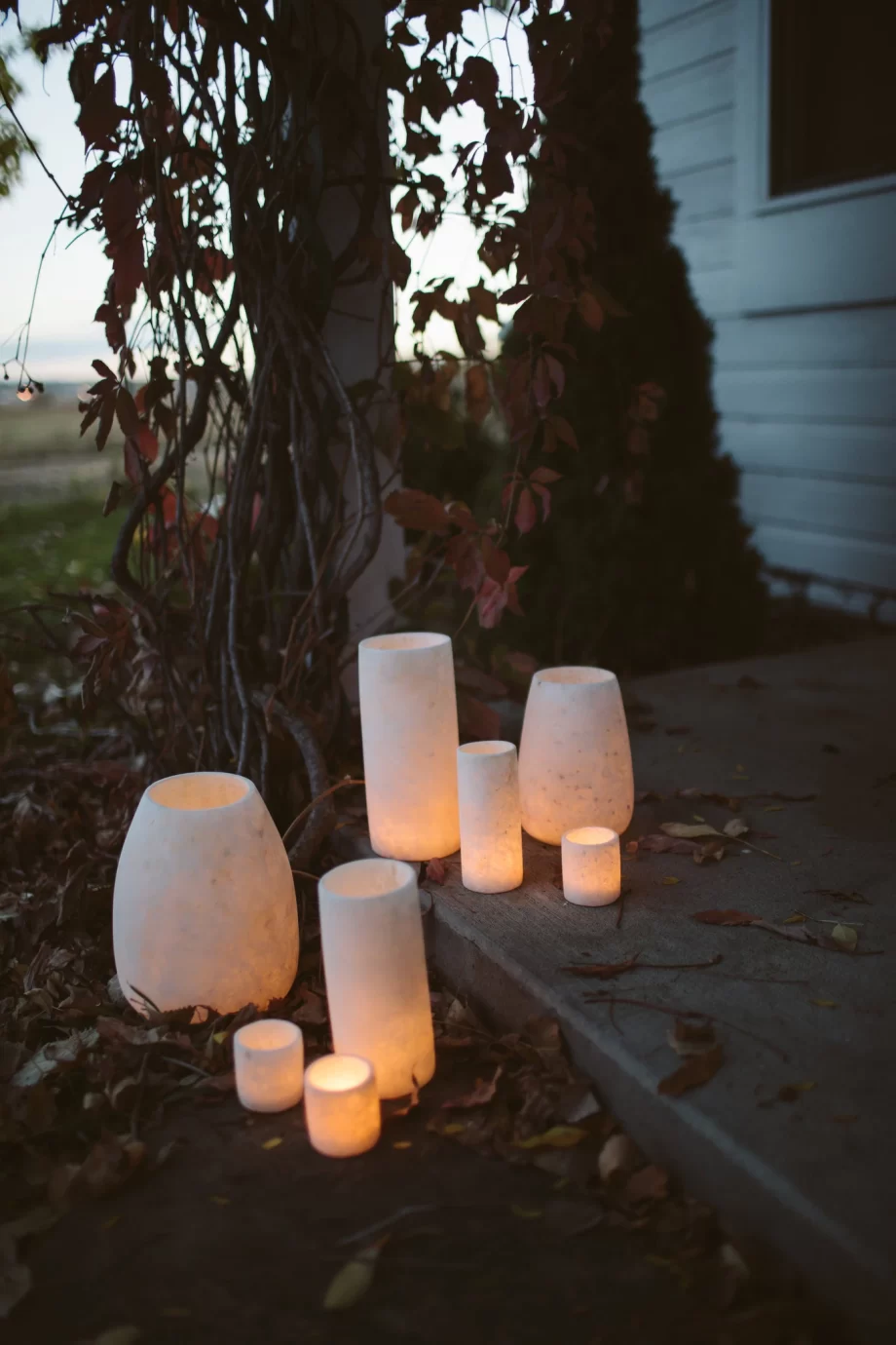 Håndskårne lysestake i albaststein i en sylinderform, utstråler en varm glød. Disse steinlysestakene er rike på jordiske mineraler, og kan variere litt i fargenyanse, størrelse og tekstur. Noen lysestaker har gråbrune sandstriper, som er rester av de store sandstormene som streifer rundt i den gamle egyptiske oasen.