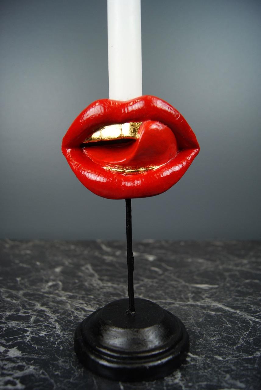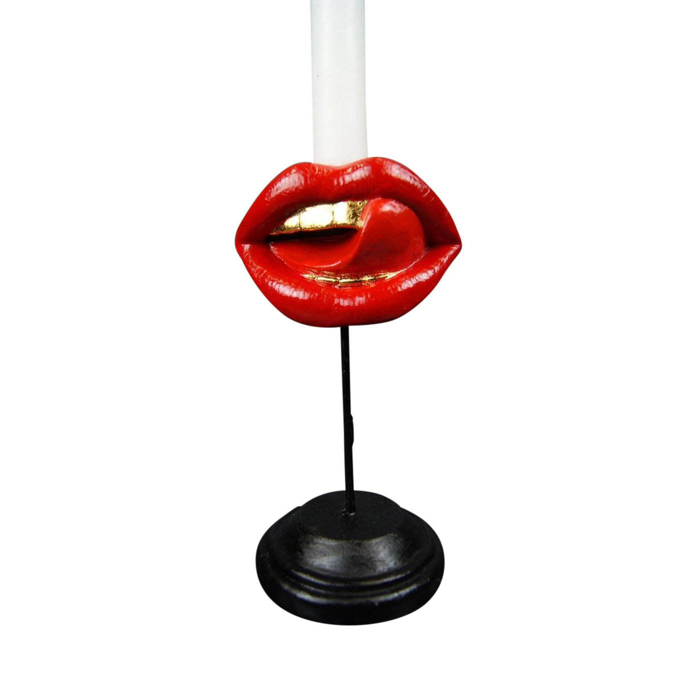 Denne unike lysestaken med røde lepper kan gi et sexy pop-art utseende til hjemmet ditt. Gullbladdetaljene på dette produktet blir perfeksjonert av den menneskelige hånden. Håndlaget på Filippinene