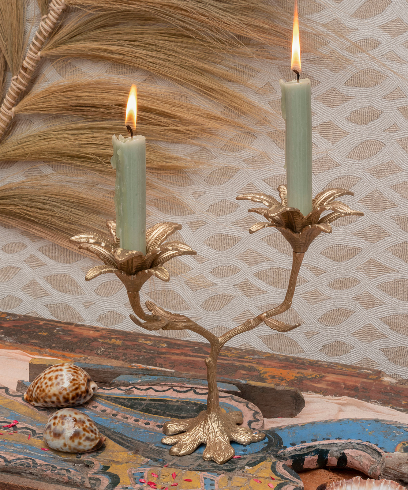 Dekorativ, håndlaget lysestake i messing.