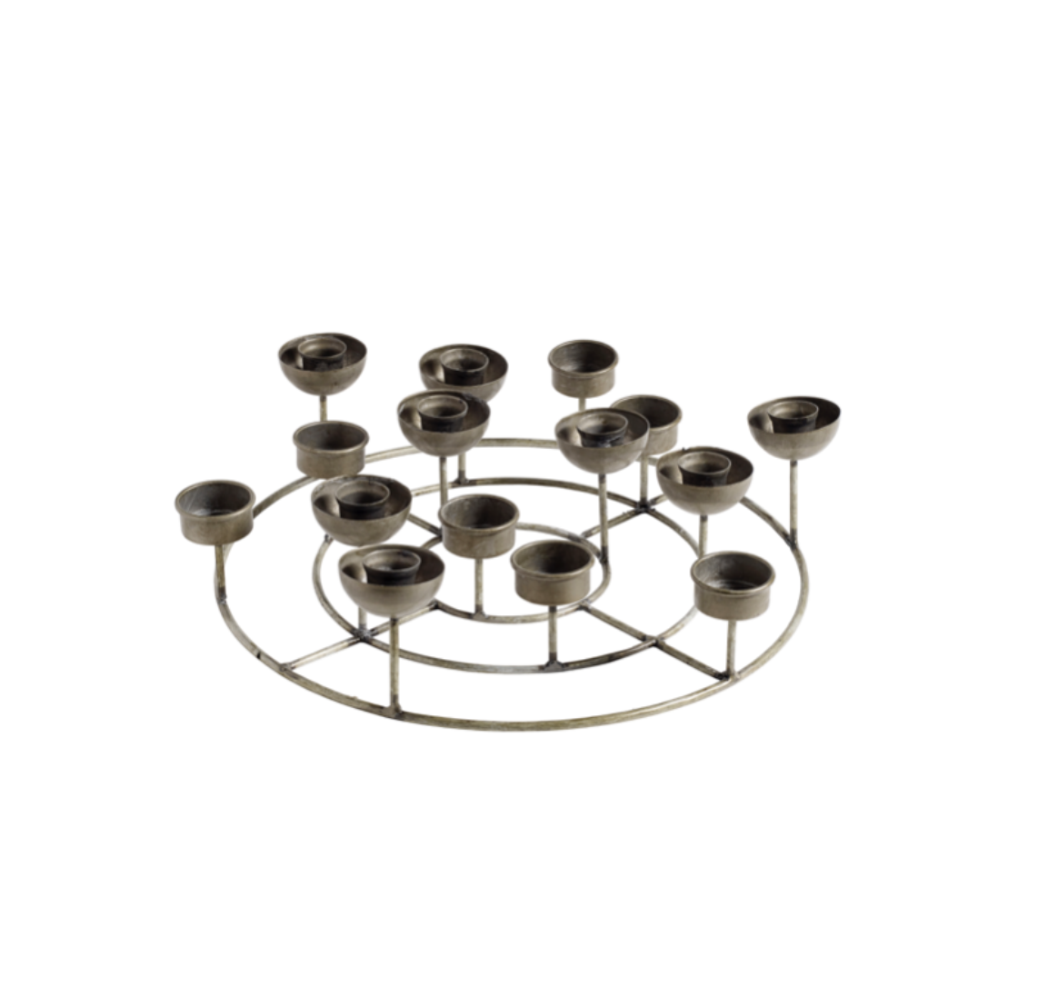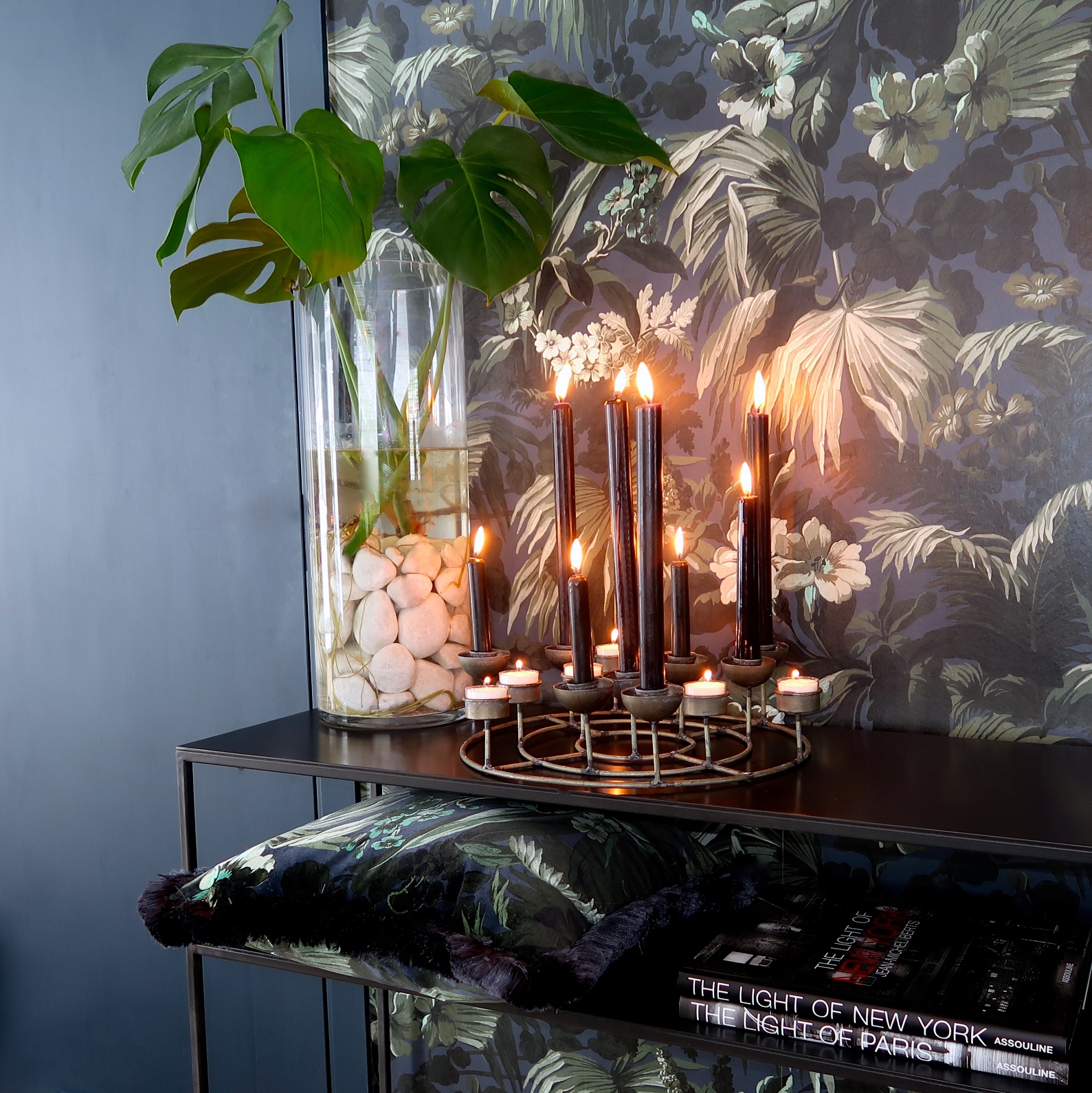 Dekorativ lysestake i rustikk jern, til både telys og kronelys. Plass til 7 telys og 8 kronelys .