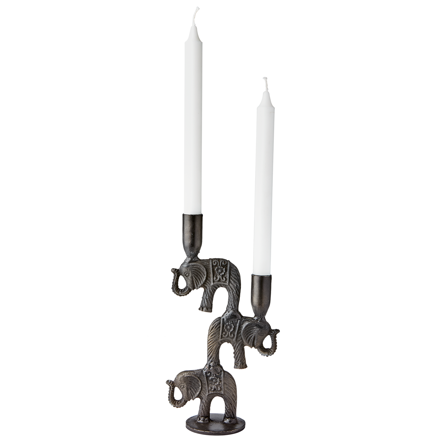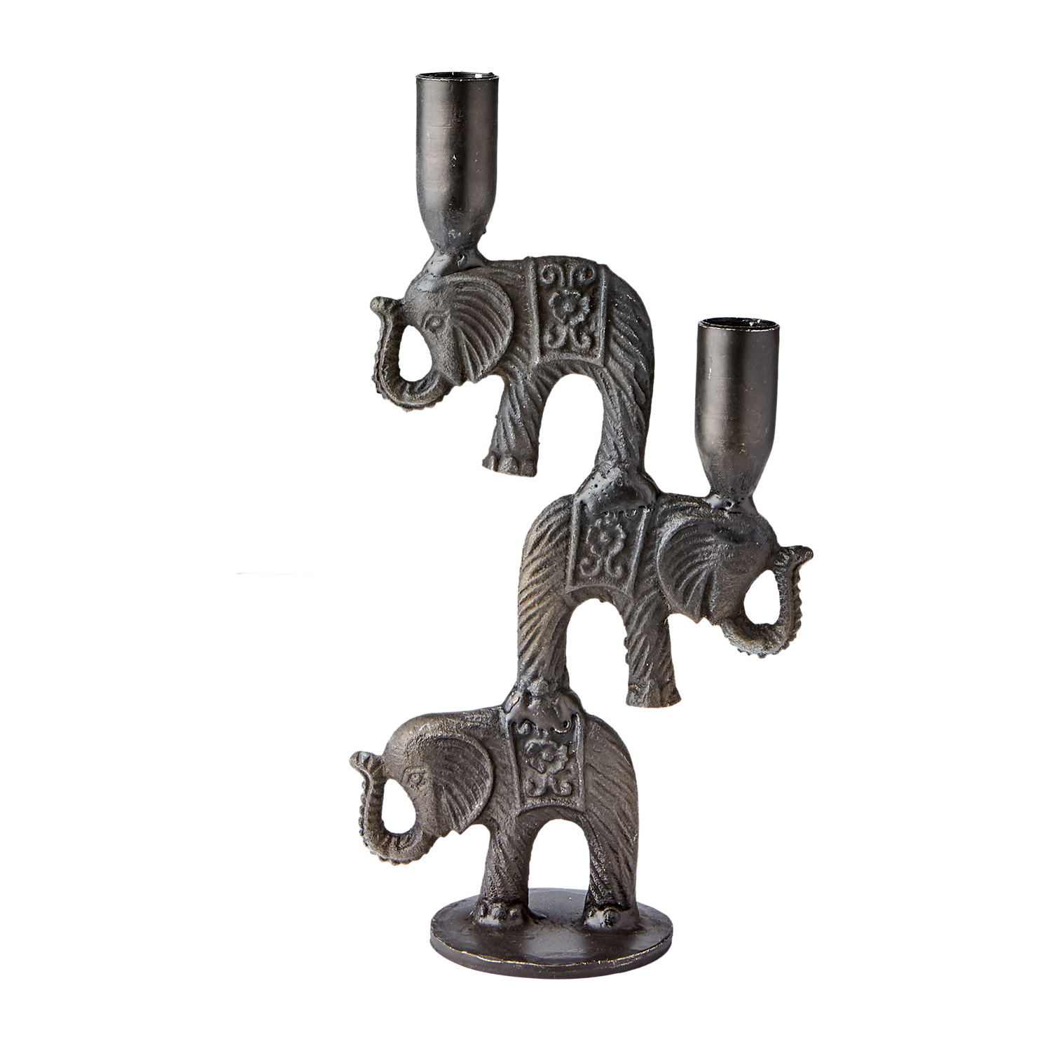 Unik og håndlaget lysestake til 2 kronelys i metall, med tre elefanter.