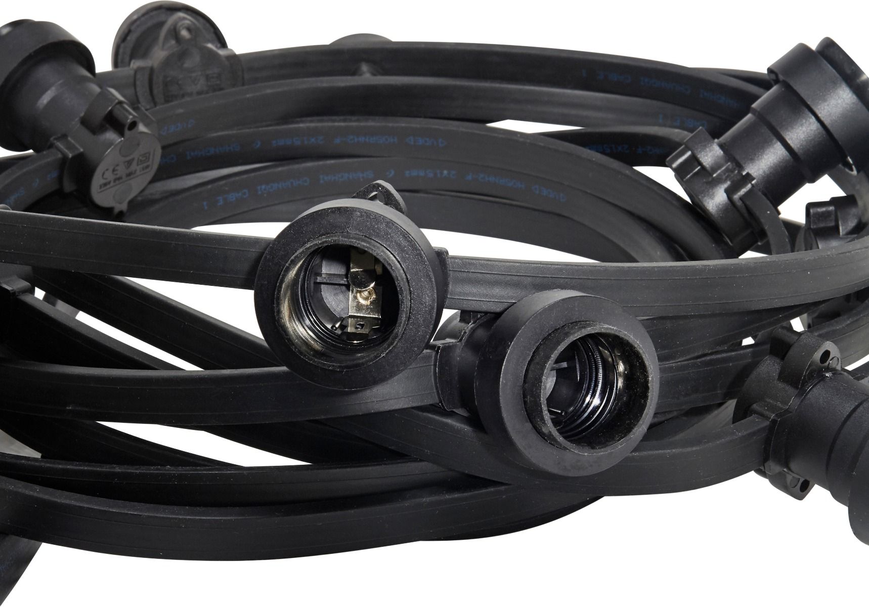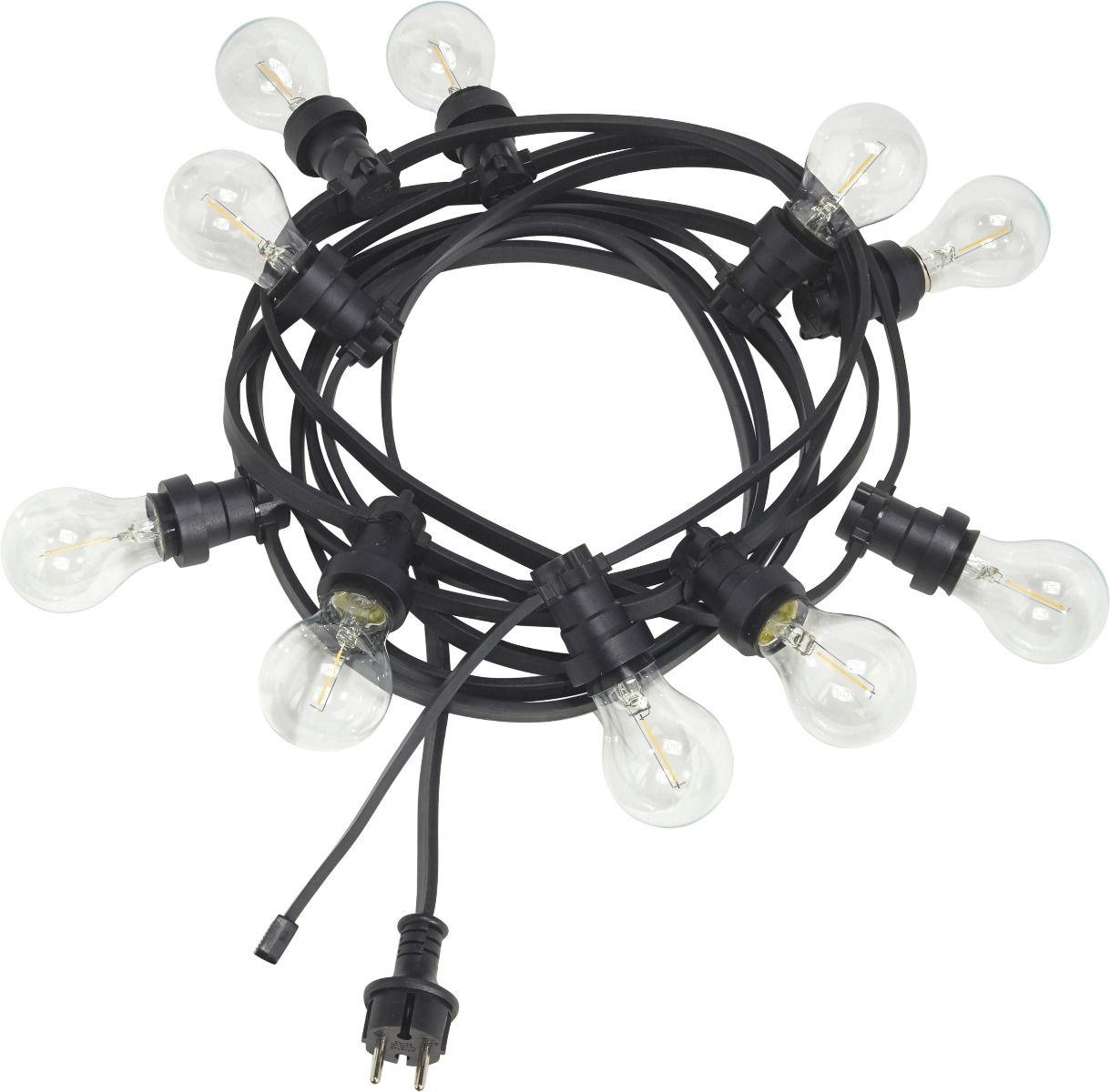 Dekorativ lyslenke til både ute og innebruk. Lyslenken er 7,2 meter lang, det er 0,5 m mellom hvert lyspunkt, fra siste lyspunkt til stikkontakt er det 2,5 m, det følger med 10 stk LED lyspærer, E27, 2W.