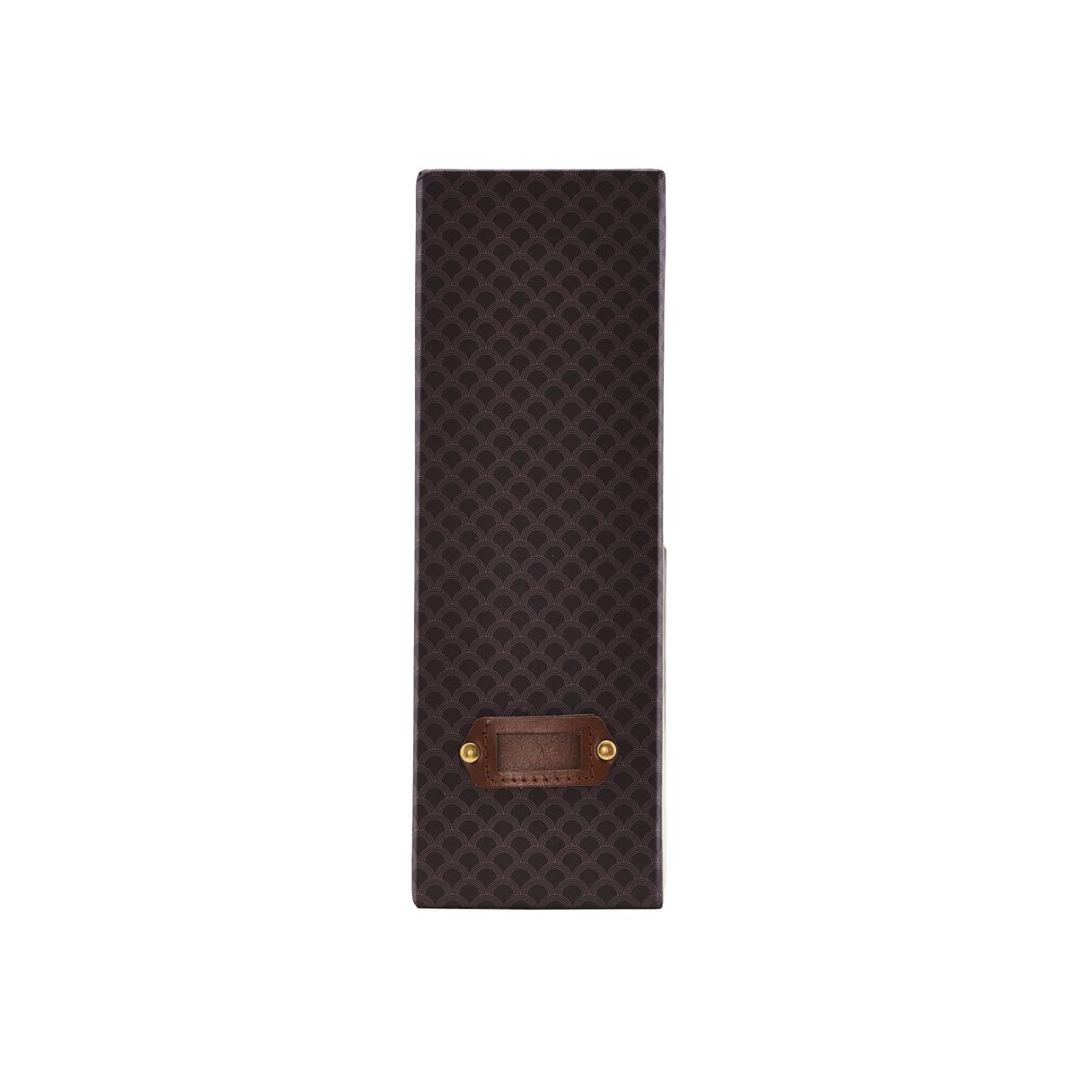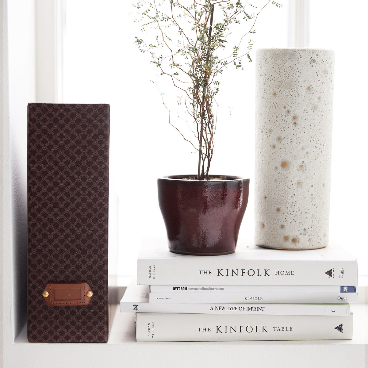 Magasinholder i tykk papp og dekor i skinn. Mørk lilla farge med et svakt mønster.