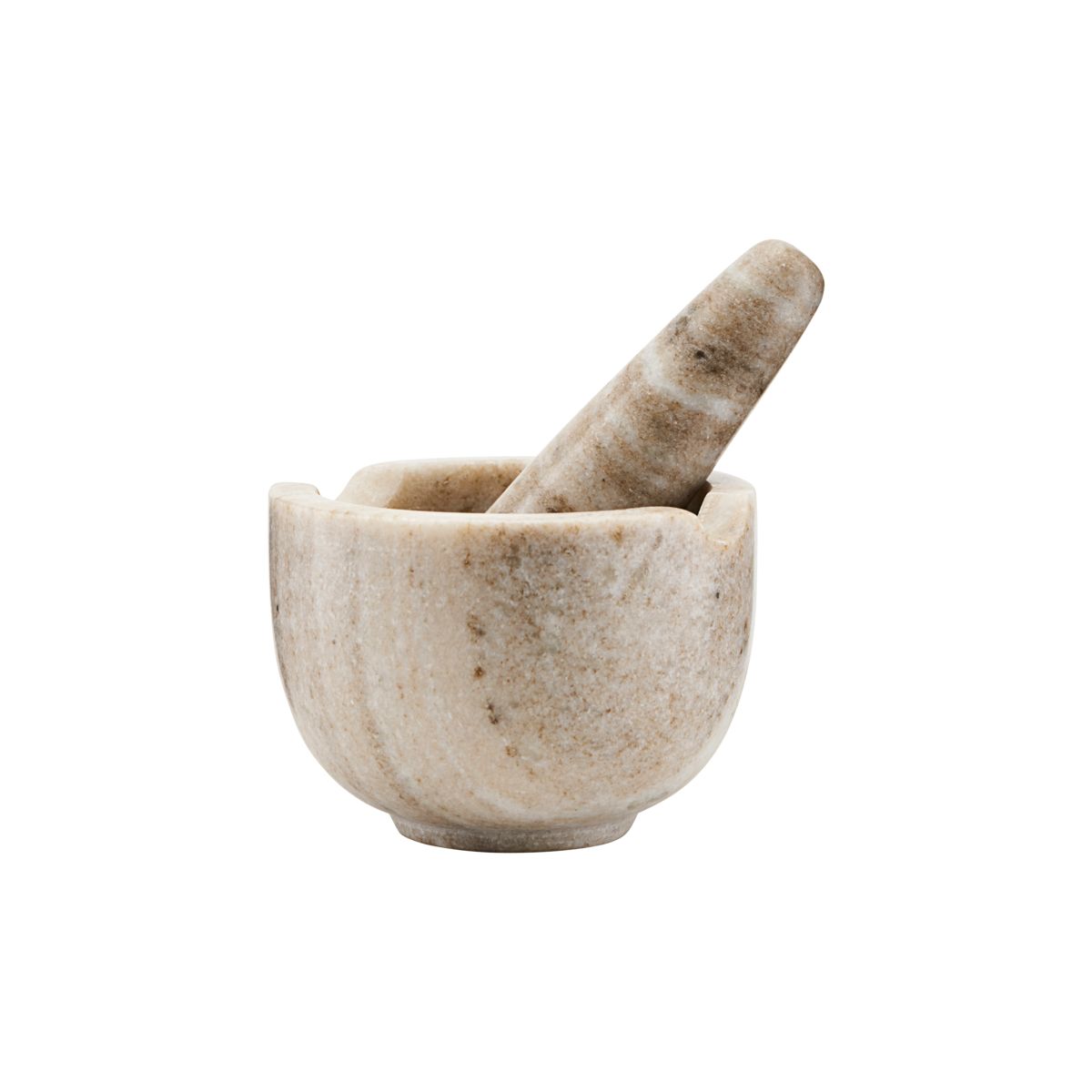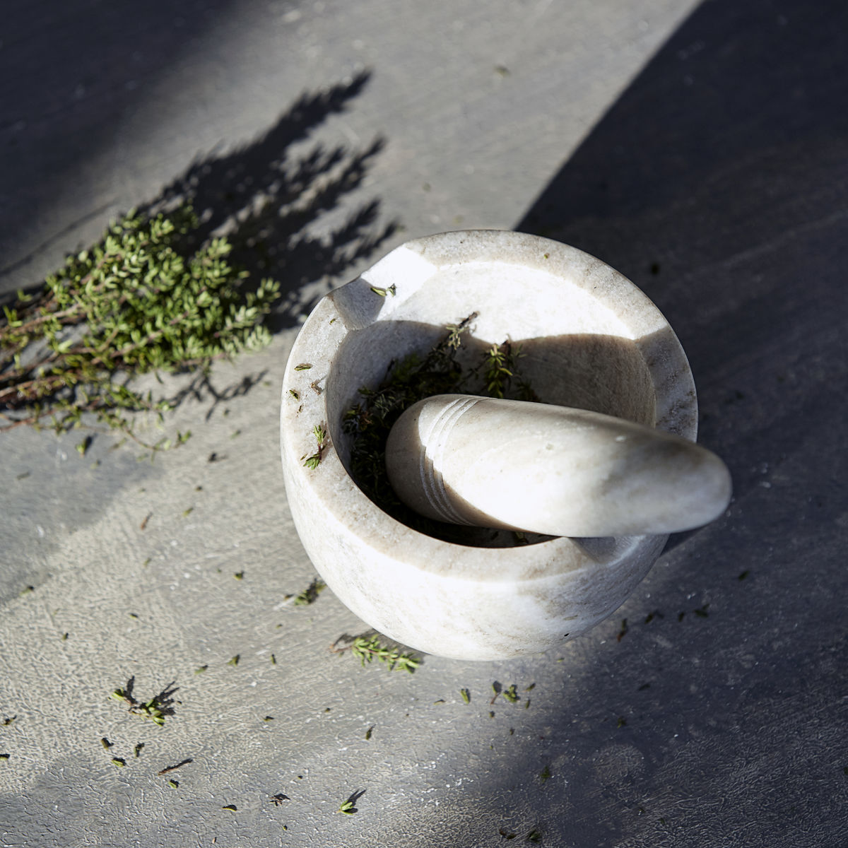 Morter i marmor. Et dekorativt element på kjøkkenbenken og praktisk til matlaging.