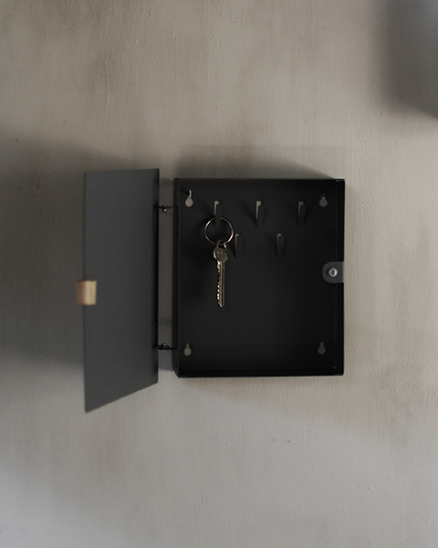Industrielt og stilrent nøkkelskap i sort metall. Kroker på innsiden til å henge fra deg nøklene.