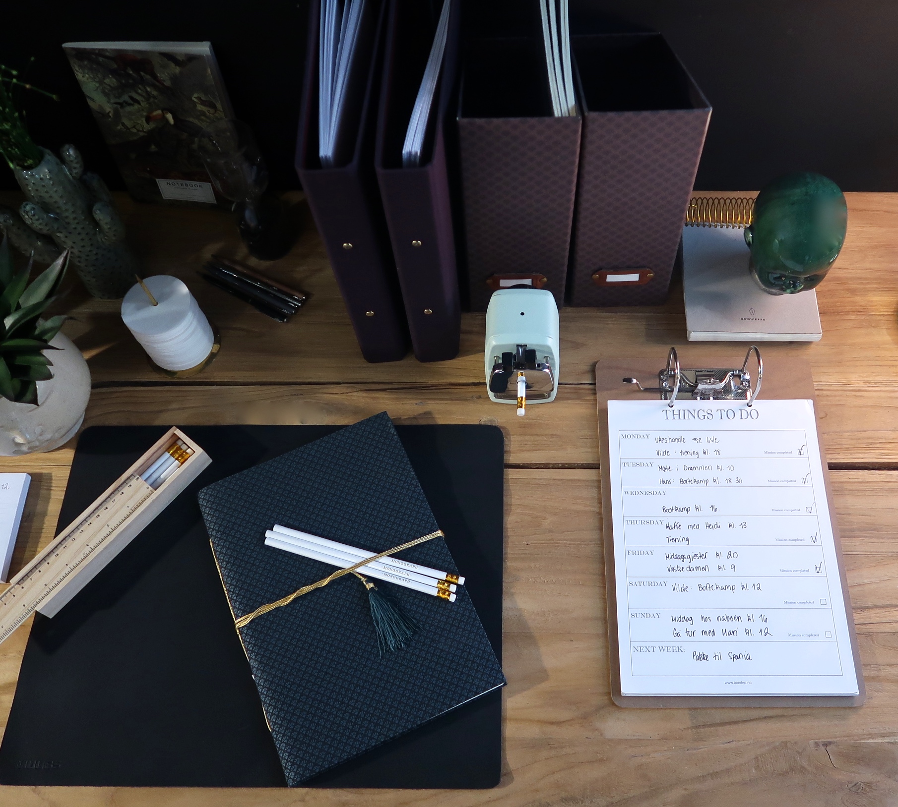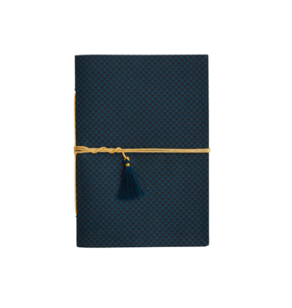 Dekorativ og praktisk notatbok med blått og sort mønster, håndlaget.