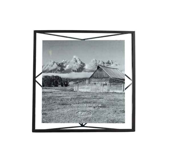 Dekorativ fotoramme  i sort metall og glass, kan stå av seg selv. Her kan du variere med bildestørrelsen, da det er glass på begge sider av fotoramme!
