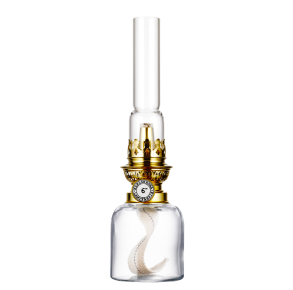 En vakker oljelampe som hever kosen et hakk. Koholmen har et oljehus i munnblåst klarglass, og lysstyrken i rundbrenneren tilsvarer omtrent lysstyrken til seks stearinlys. Vi liker konstrastene mellom glass og metall som bare blir vakrere når lampen tennes.