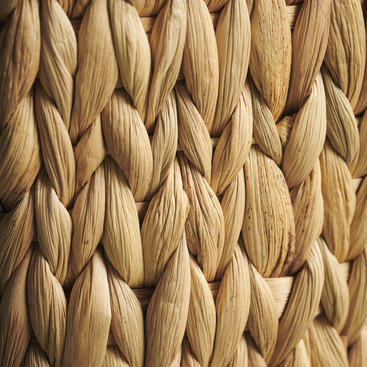 Kurven er laget av vannhyacint på en trådramme for å gjøre dem mer robuste. Med sitt brede mønster og naturlige materiale er kurven et velkomment tillegg til kjøkkenet, stuen eller badet som en balanse mellom metall, marmor og andre materialer.