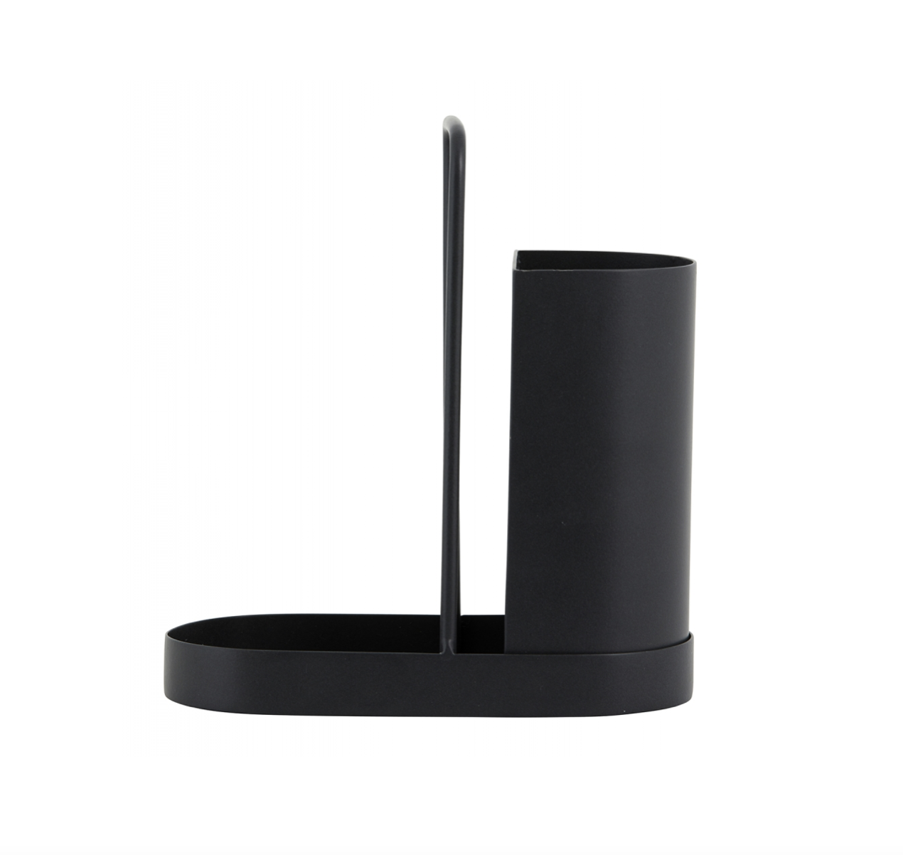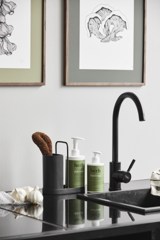 Oppgrader stilen ved kjøkkenvasken med dette vakre stativet for oppvaskmiddel, børste og oppvaskklut. Laget i rustfritt stål med svart finish og er rustsikker. Hull i beholderen for drenering.