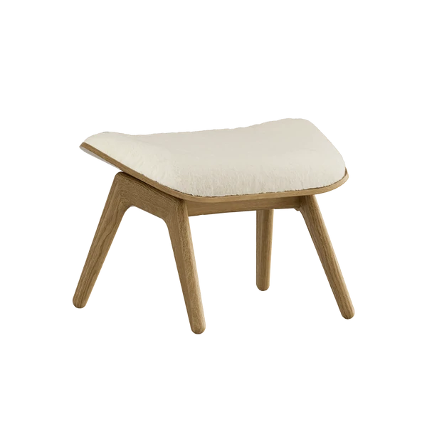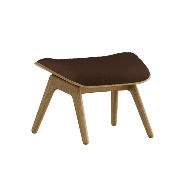 De solide eikebeinene på puffen løftes visuelt fra basen og gir designet en lett karakter. Putens form er designet for å gi ekstra fokus på tredetaljene.