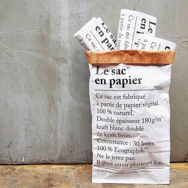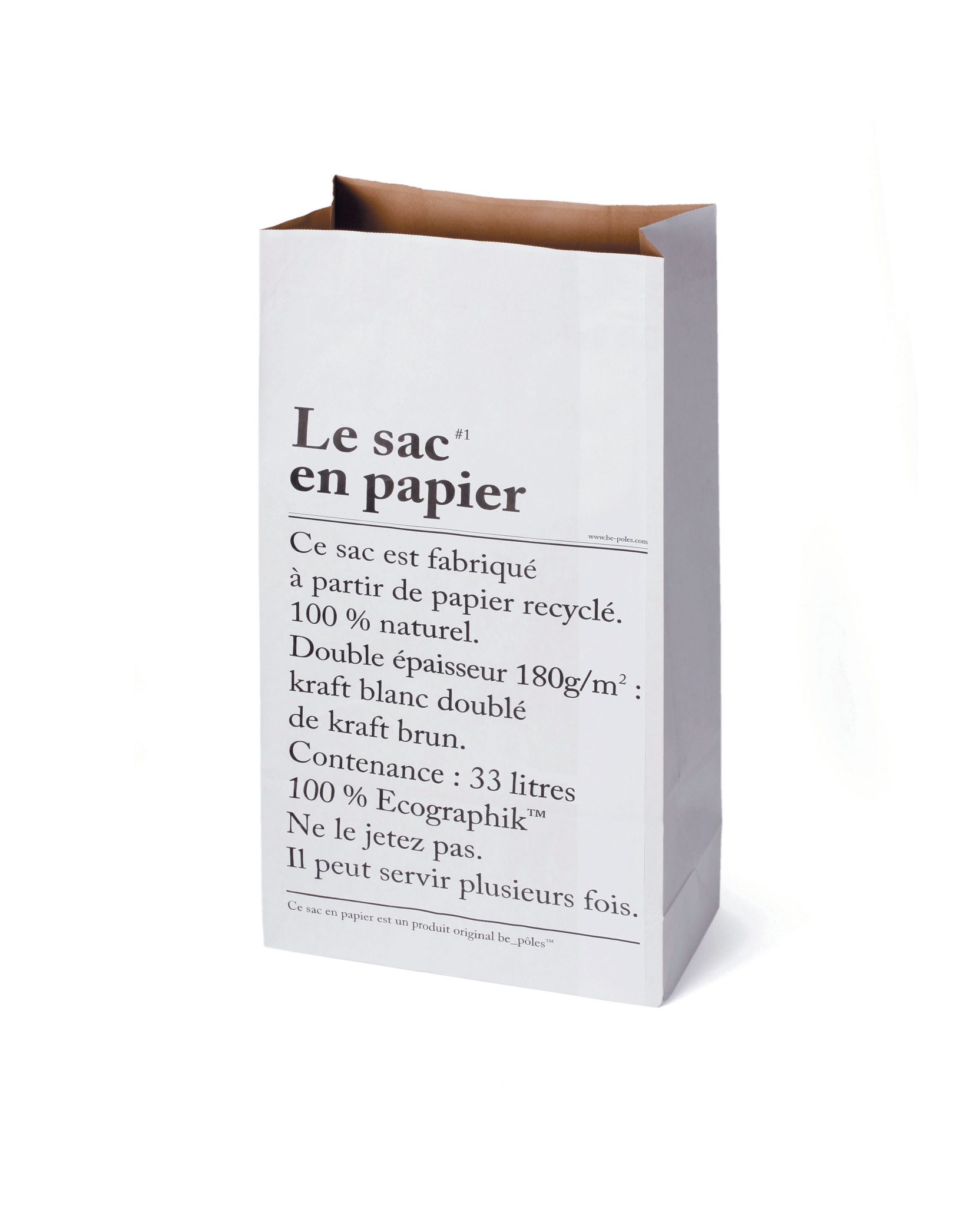Hvit papirpose laget av 100% økologisk papir med tekst på begge sider, en med fransk og den andre med engelsk.