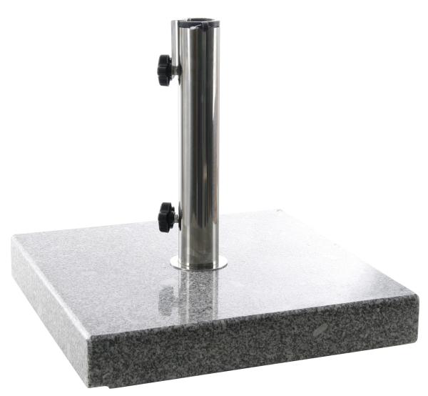 Parasollfot i polert granitt, med stålrør. Leveres med håndtak og hjul på den ene siden.