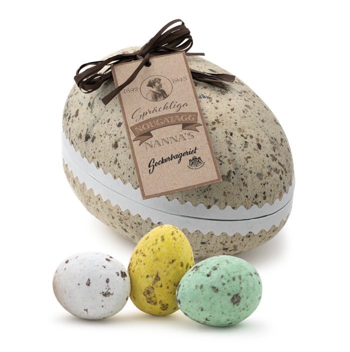 Perfekt for de som ønsker å kjøpe et ferdigfylt påskeegg med godteri. Egget inneholder flekkete nougategg.