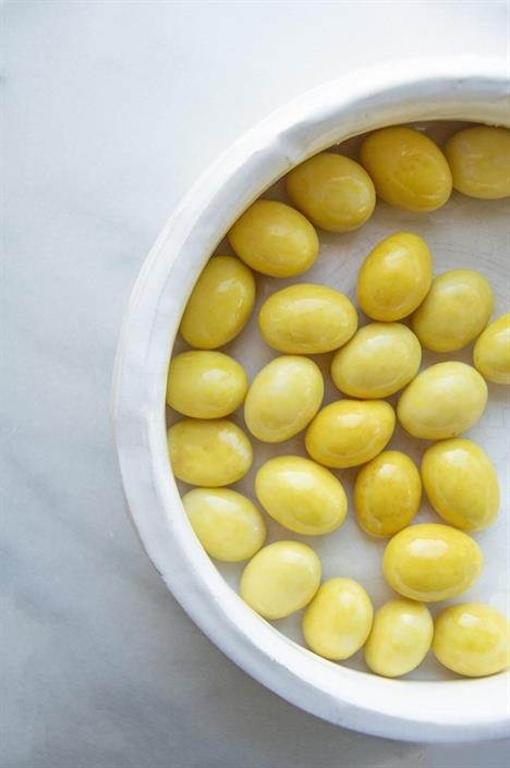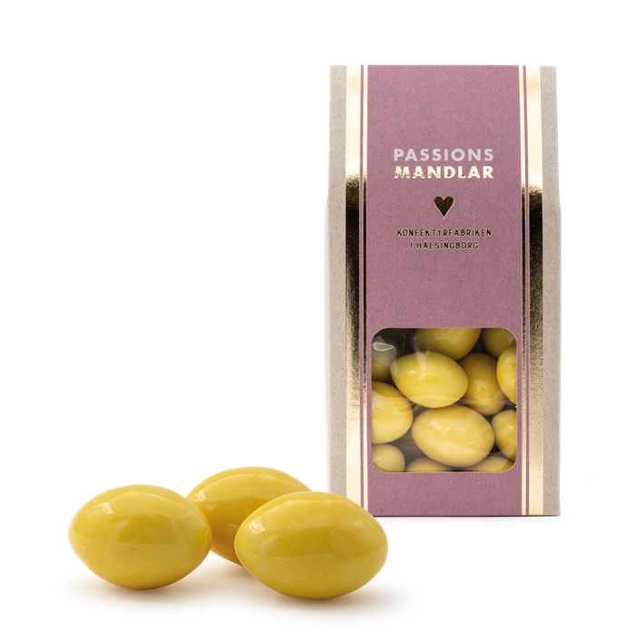Luksuriøst påskegodteri. Himmelsk deilige mandler med hvit sjokolade og pasjonsfrukt