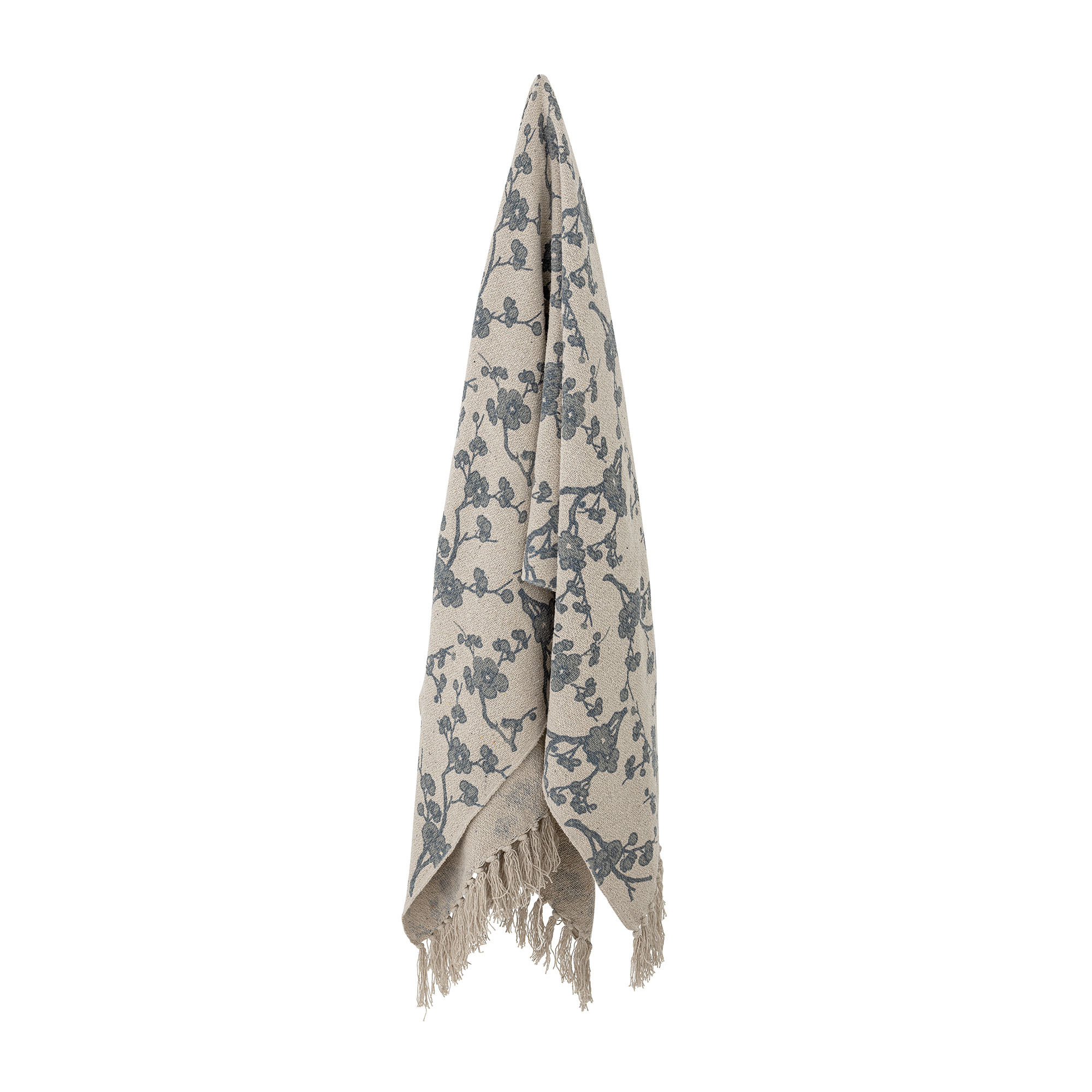 Dette pleddet er et behagelig vevd pledd laget av resirkulert bomull, med blå blomster trykt på en naturlig bakgrunn. Omgitt av frynser minner denne delikate komposisjonen om klassiske japanske scener og vil gi sofaen eller lenestolen mye stil.