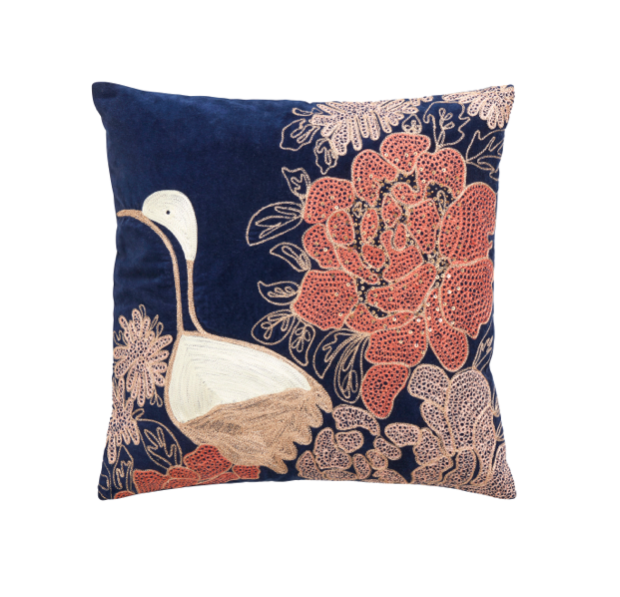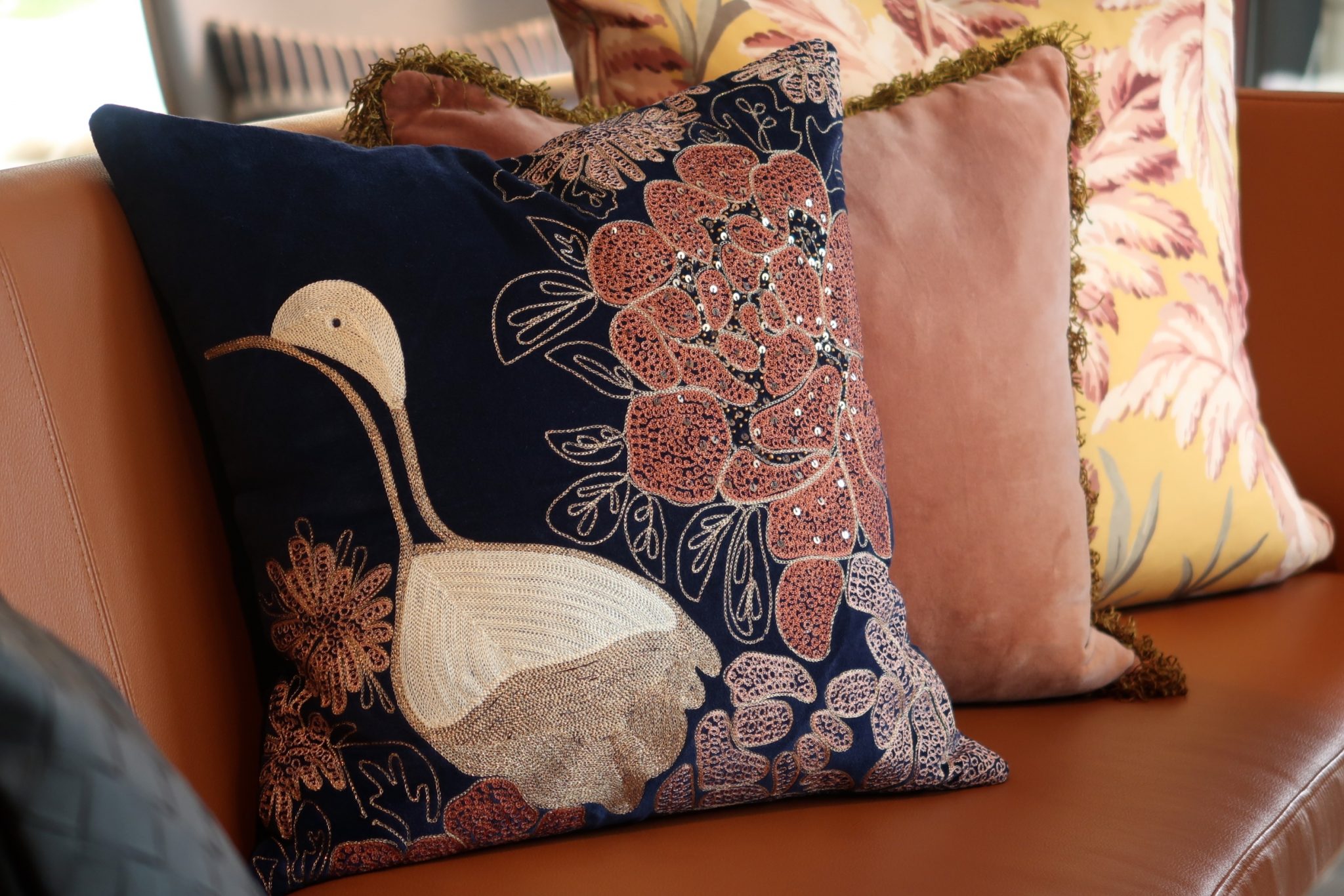 Putetrekk med broderte blomster og fugl i varme farger, 100 % bomull velvet.