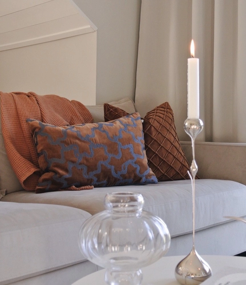 Brodert putetrekk Chand i cognac med sjøblått broderi 40 x 60 cm. Innviklet broderi på fløyelen. Baksiden av puten er ren og indre puter er ikke inkludert.