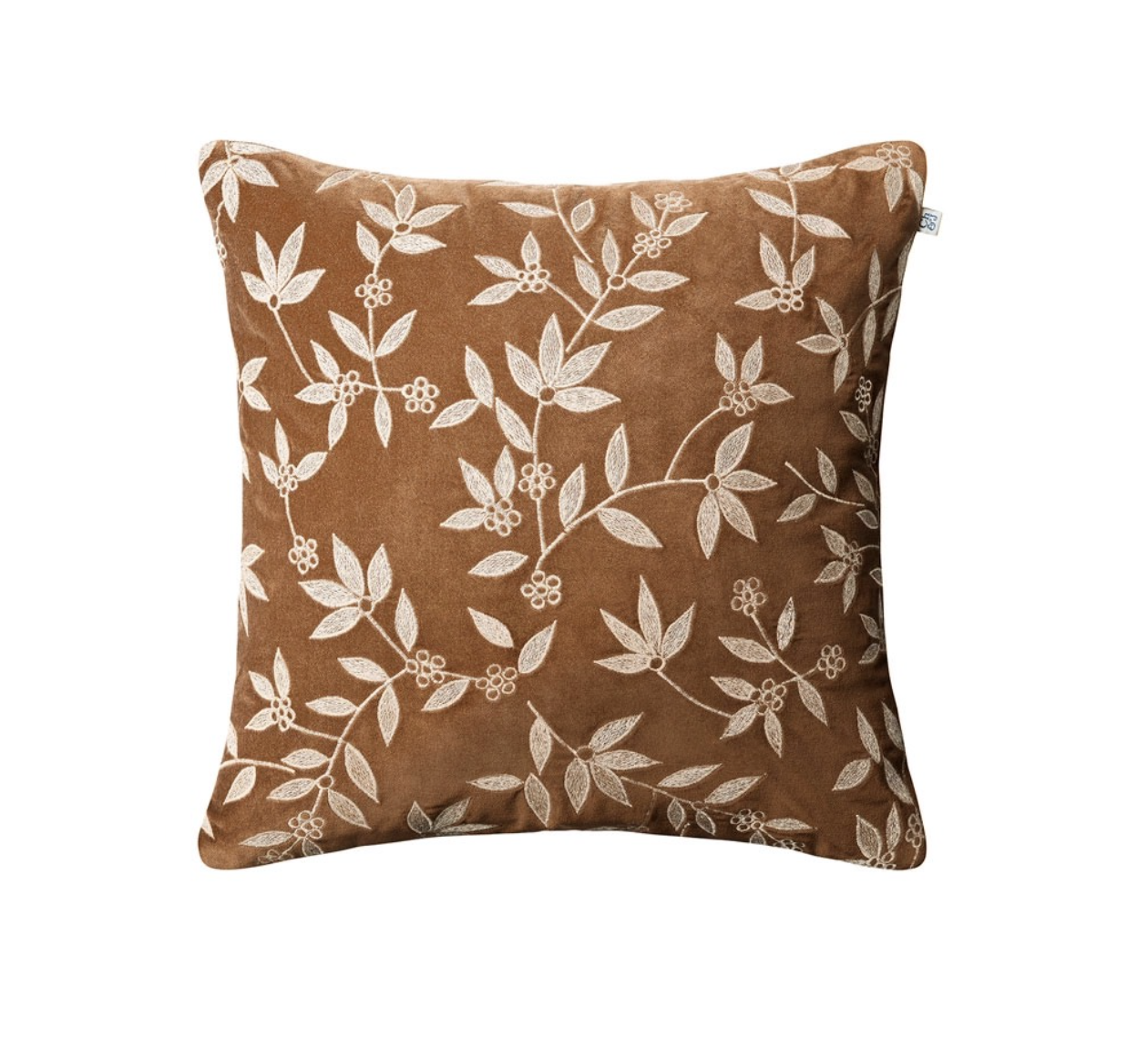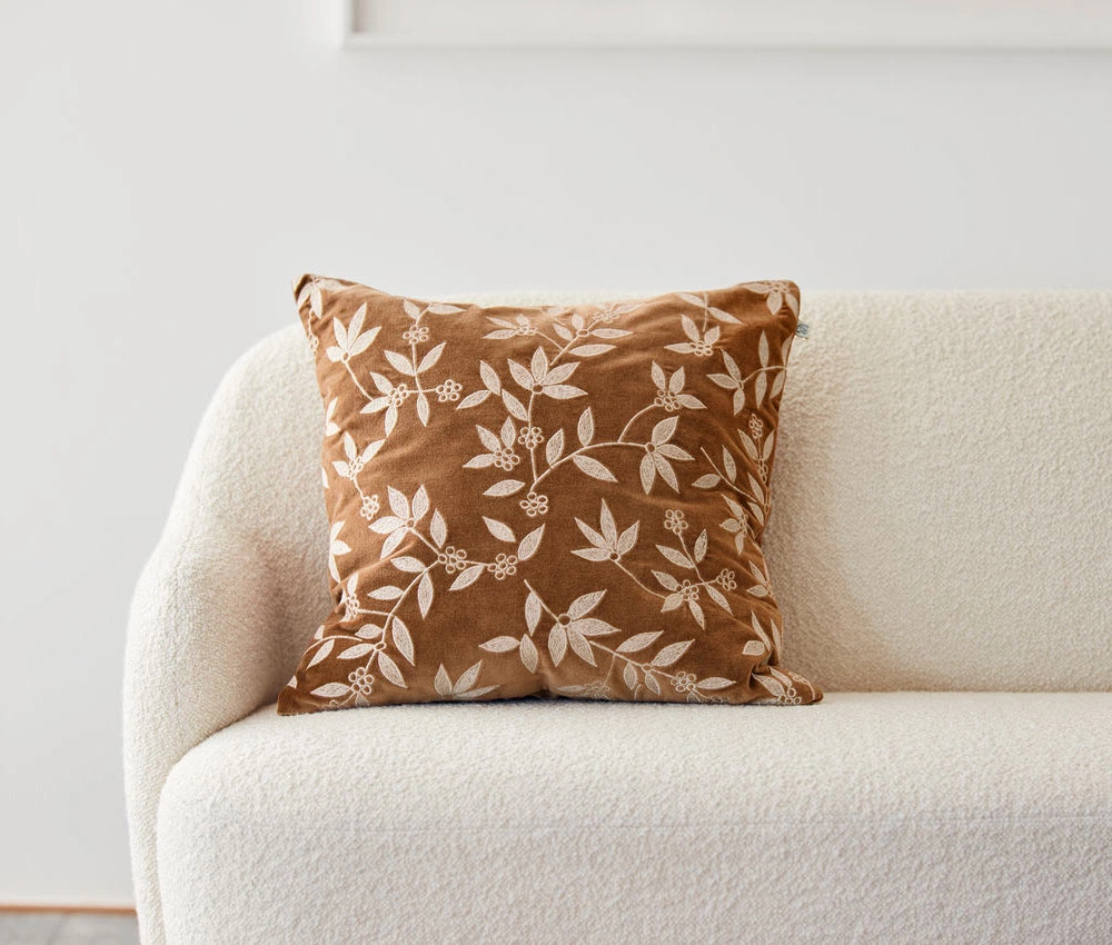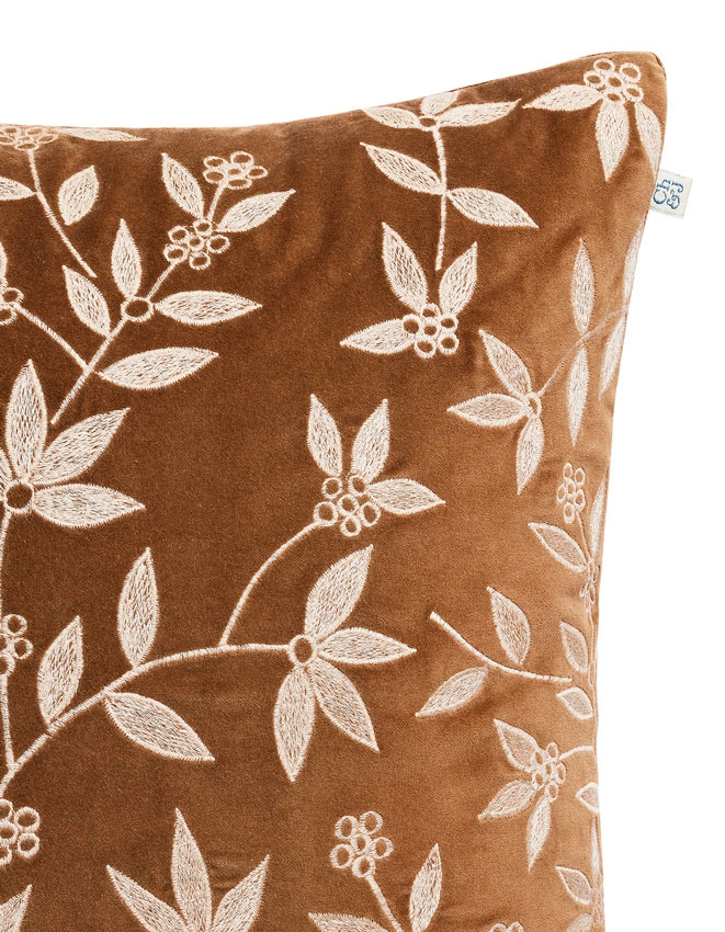 Fløyelsputetrekk Gita har et vakkert blomsterbroderi i beige på cognacfløyel.