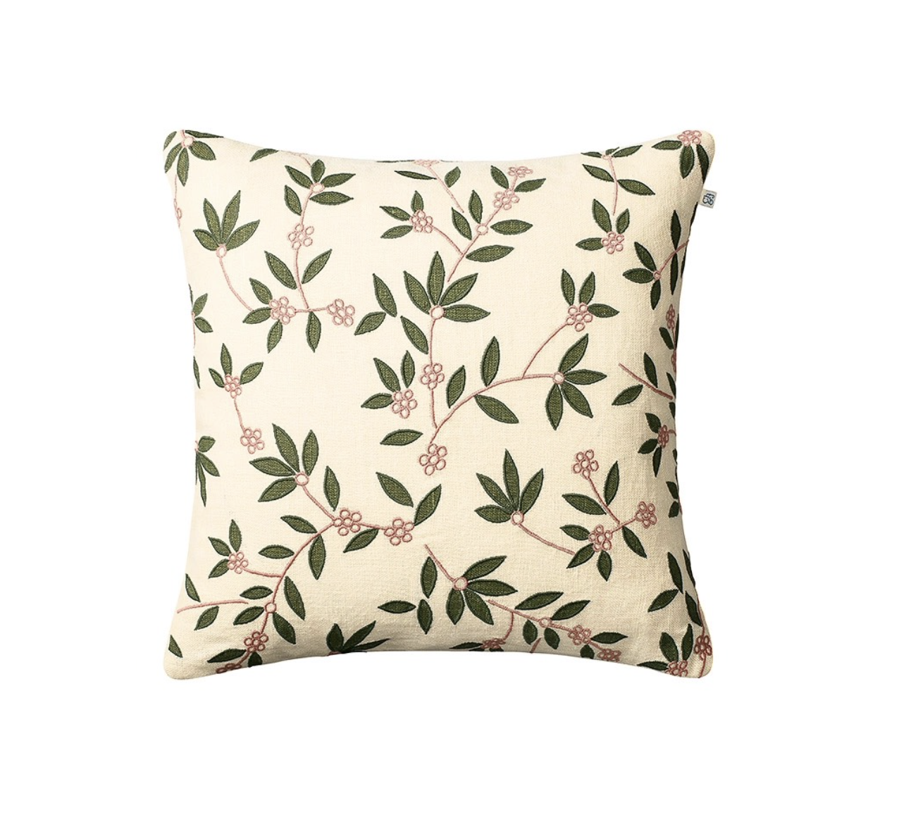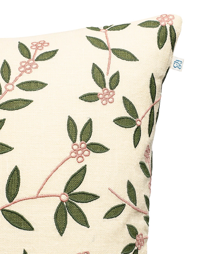 Putetrekk i lin Gita er både håndtrykt og brodert med blomsterdesign på lin. Kombinasjonen av trykk og broderi i fargene Cactus green og Rose gir den et særpreg.