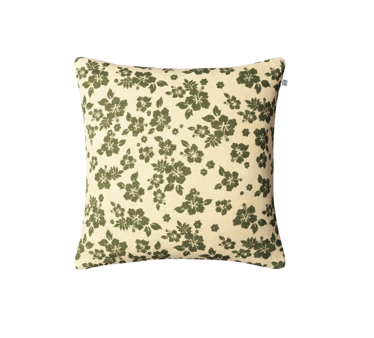 Putetrekk i lin – Indu Light Beige/Cactus Green. Bring varme vibber til ethvert rom i hjemmet ditt med denne lekne florale bestemor-chic puten.
