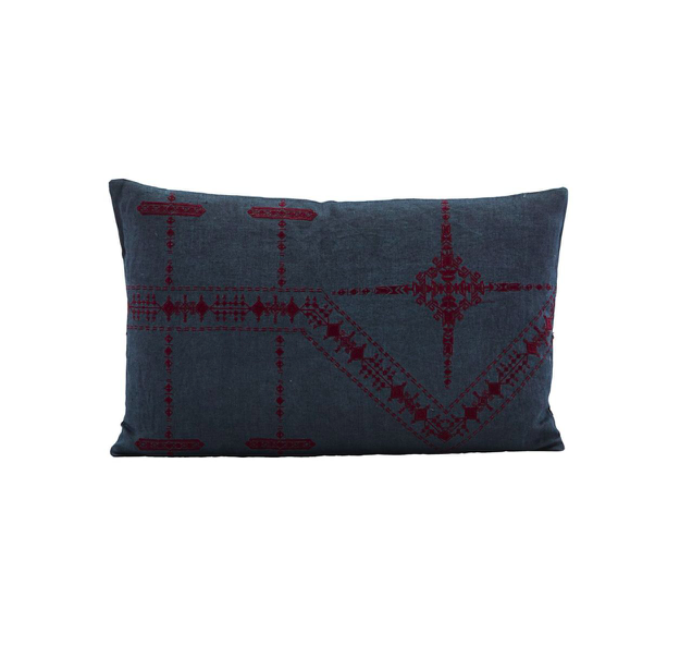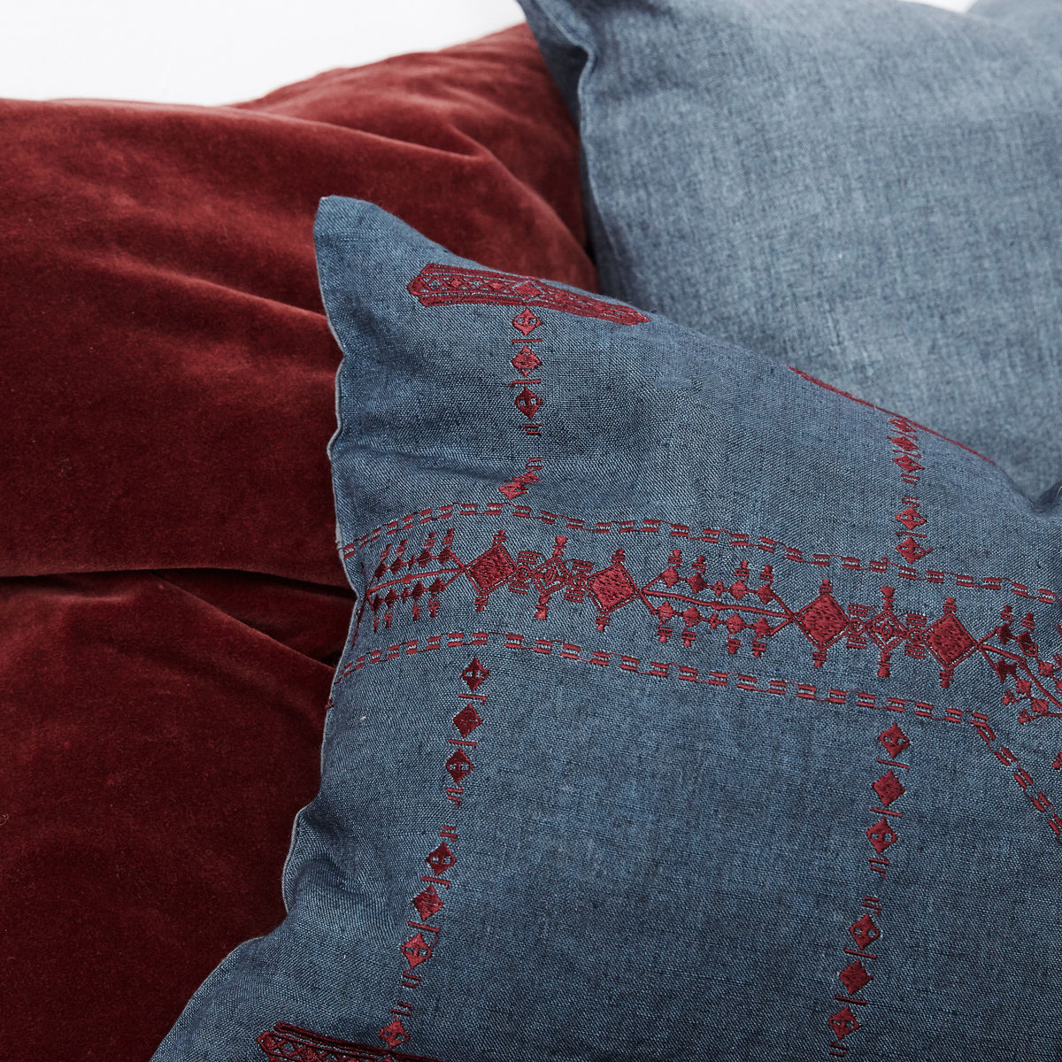 Putetrekk i 100 % lin, blå med brodert mønster i vinrød.