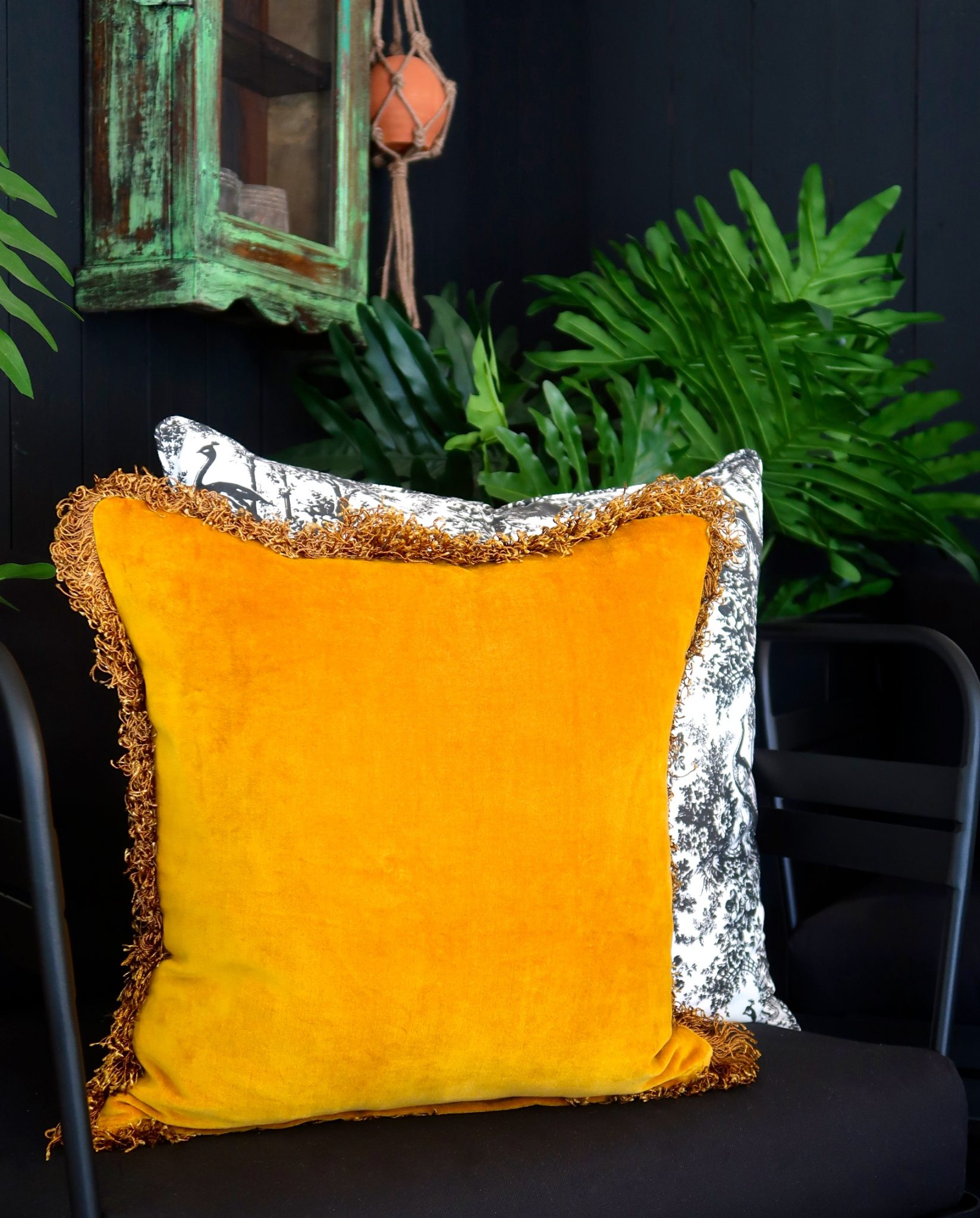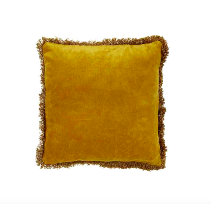 Putetrekk, sennep med frynser, velur. 100 % bomull og kan vaskes i vaskemaskin på 30 grader.