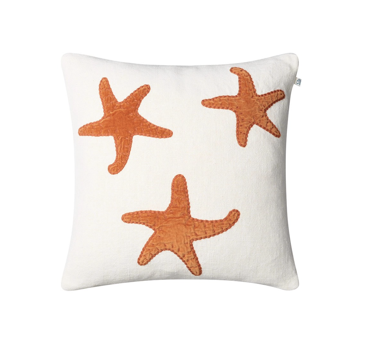 Få havet hjem med dette dekorative putetrekket med sjøstjerner. En oransje fløyelsstjernefisk brodert på offwhite naturlig lin.
