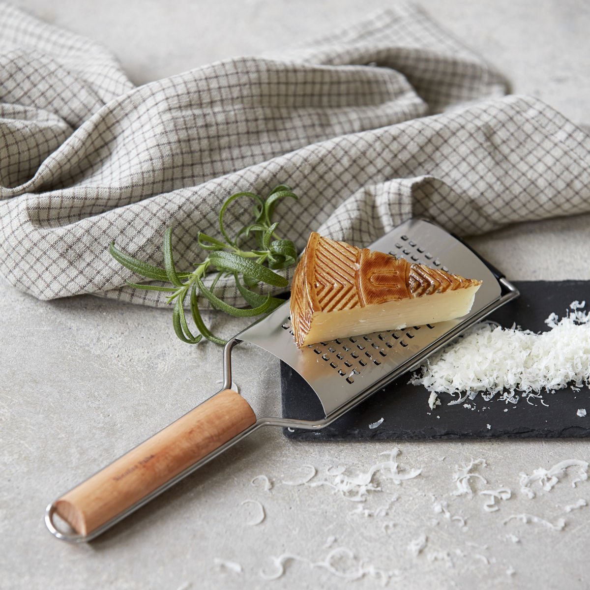 Denne fine raspen er det perfekte verktøyet når du vil lage deilig mat på kjøkkenet. Raspen er spesielt egnet til hvitløk, løk, parmesan, muskat, sitrus og lime, og generelt mat som du vil rive ekstra fint. Raspens håndtak er laget av flott bøk, som sikrer at produktet er fint å jobbe med. Riven er laget av rustfritt stål, noe som sikrer lang levetid. Vi anbefaler at du vasker produktet for hånd.