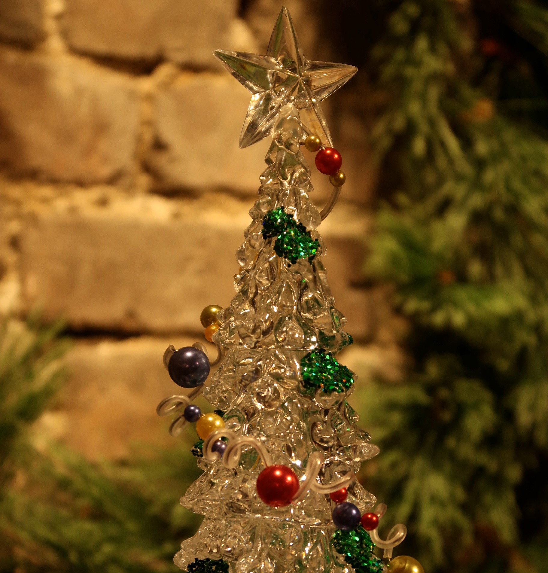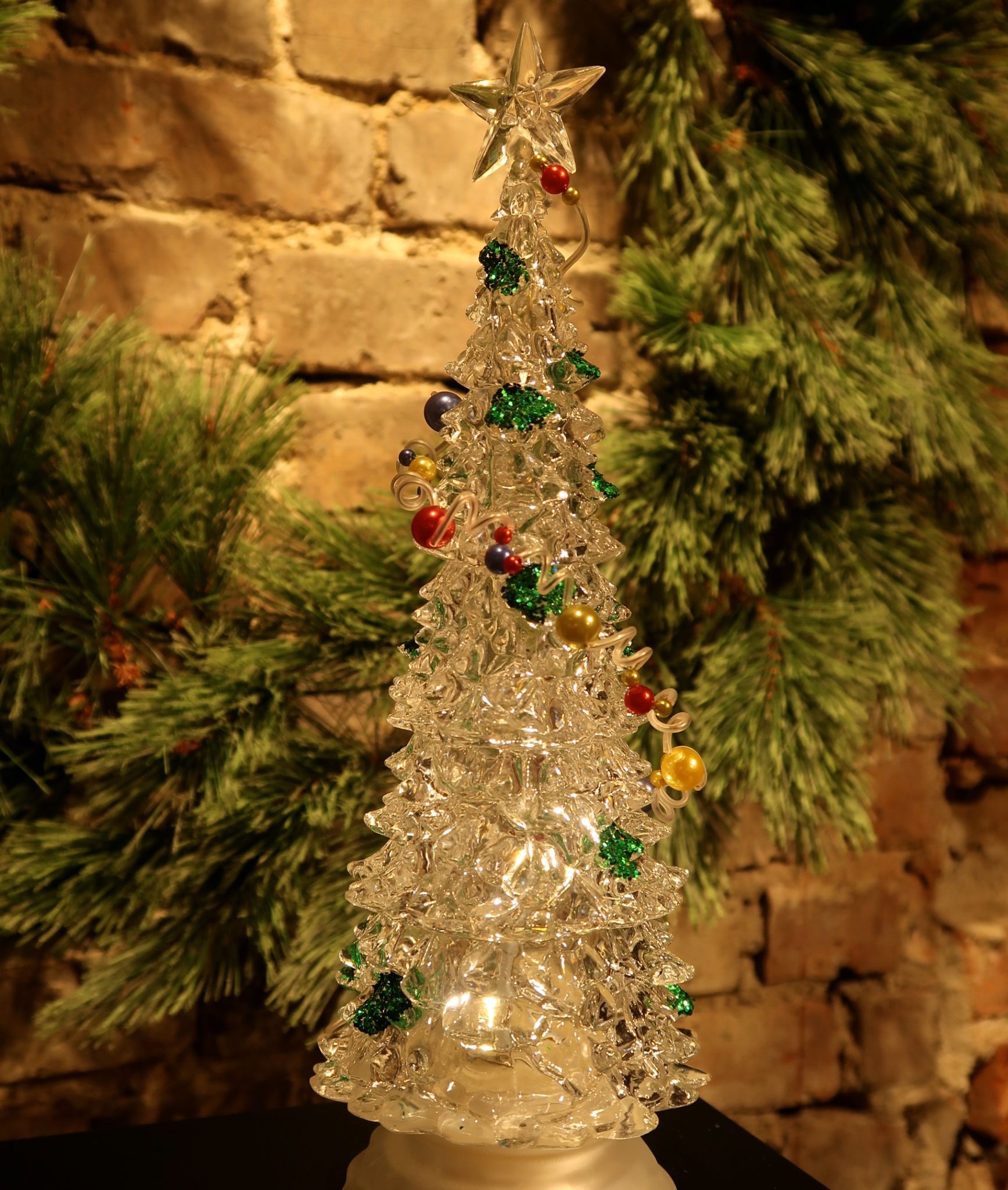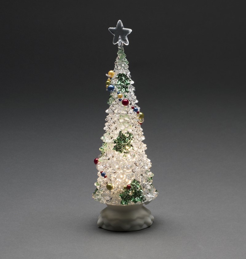 Roterende juletre i akryl med dekorasjoner. Timer på 5 timer hvilket gjør at den automatisk slår seg av 5 timer etter den er blitt skrudd på.