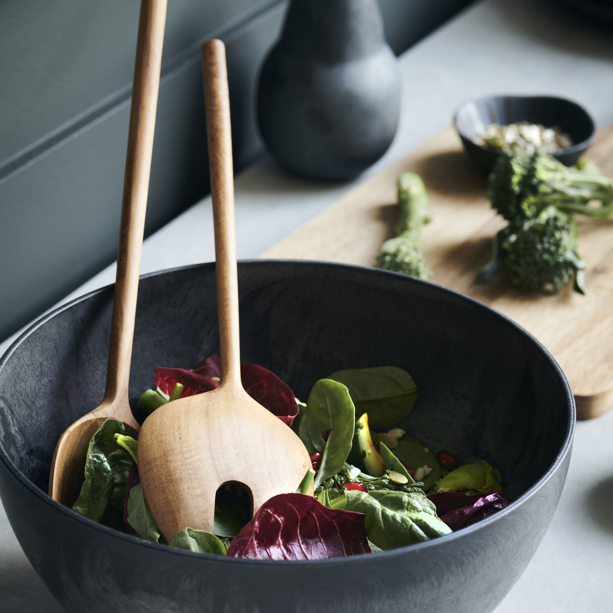 La gjestene forsyne seg selv med en deilig salat med dette salatbestikket kalt Grabi fra House Doctor. De er laget av teak og kommer i en dyp brun farge og gir et naturlig og rustikt preg på et pent dekket bord. Du får et minimalistisk design i et slitesterkt materiale som er perfekt for hverdagsmiddager med venner og familie