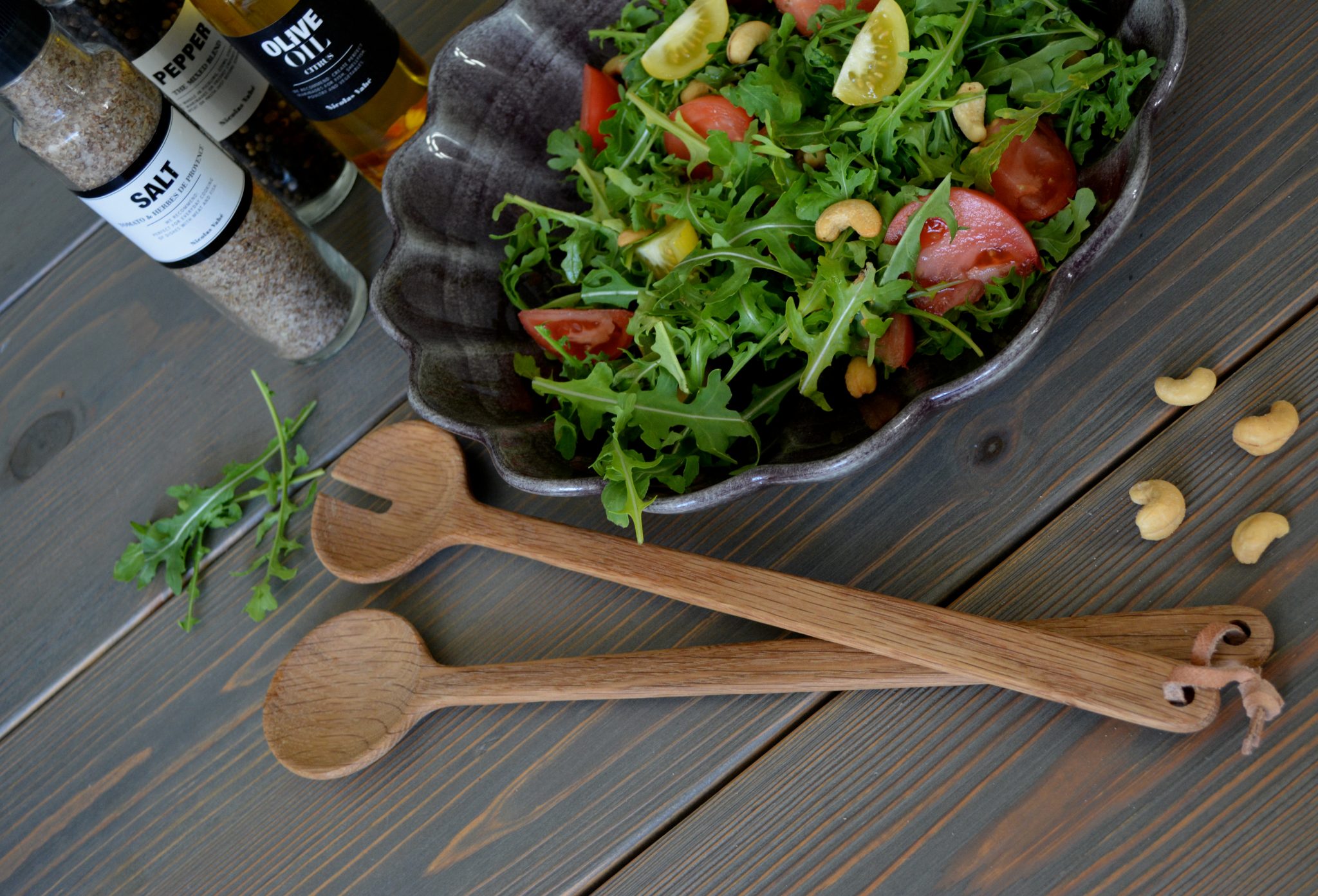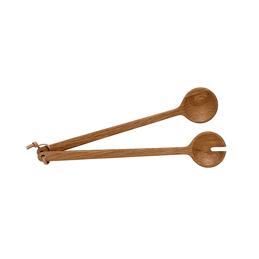 Flott salatbestikk i tre med skinnsnor. Sett a 2 stk