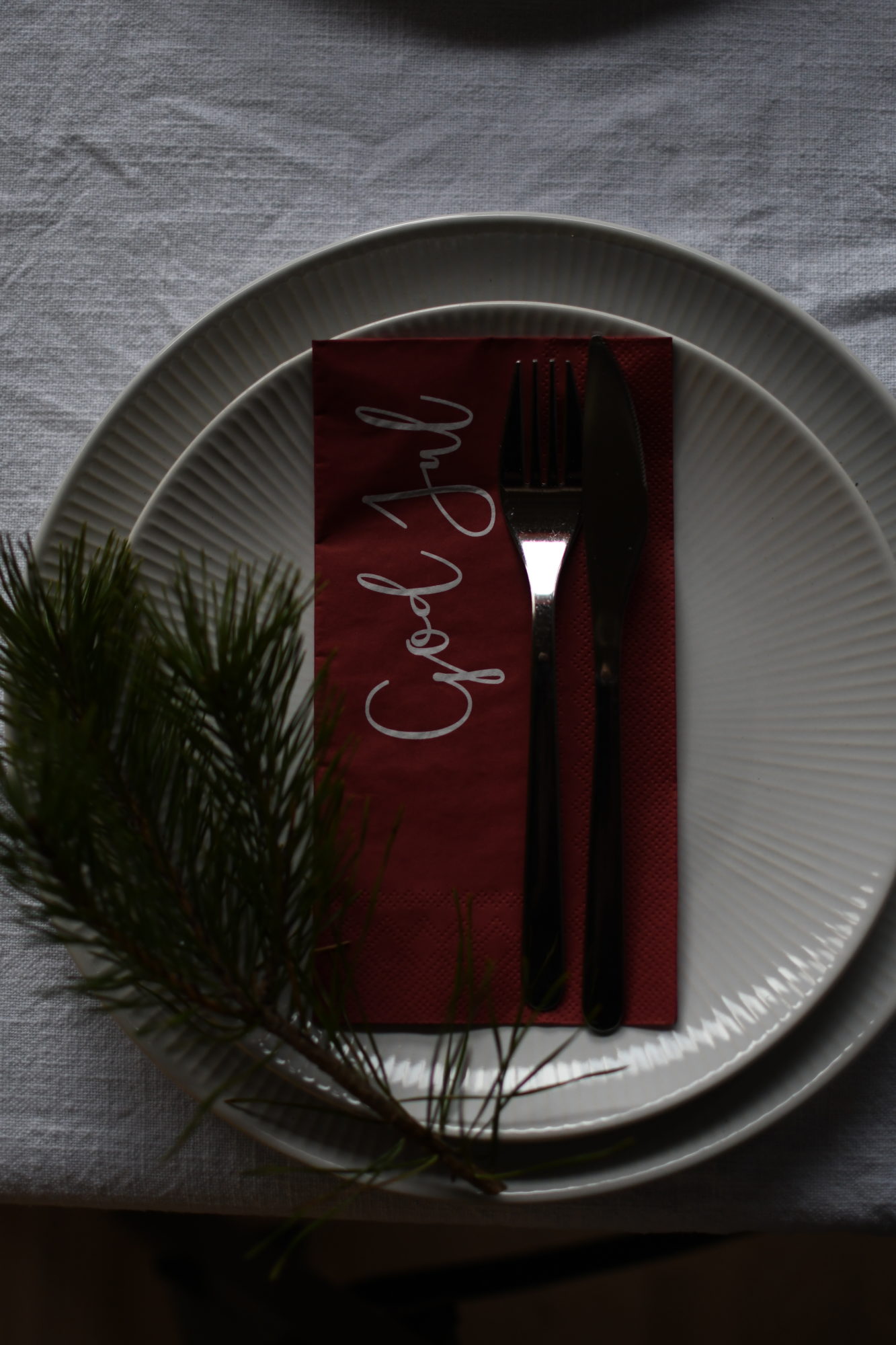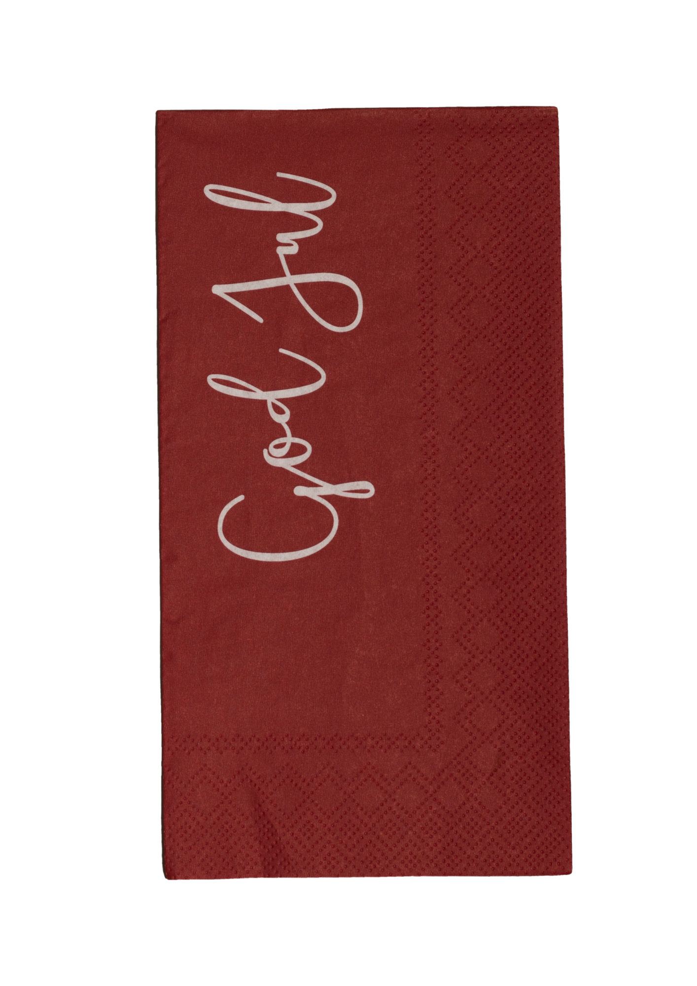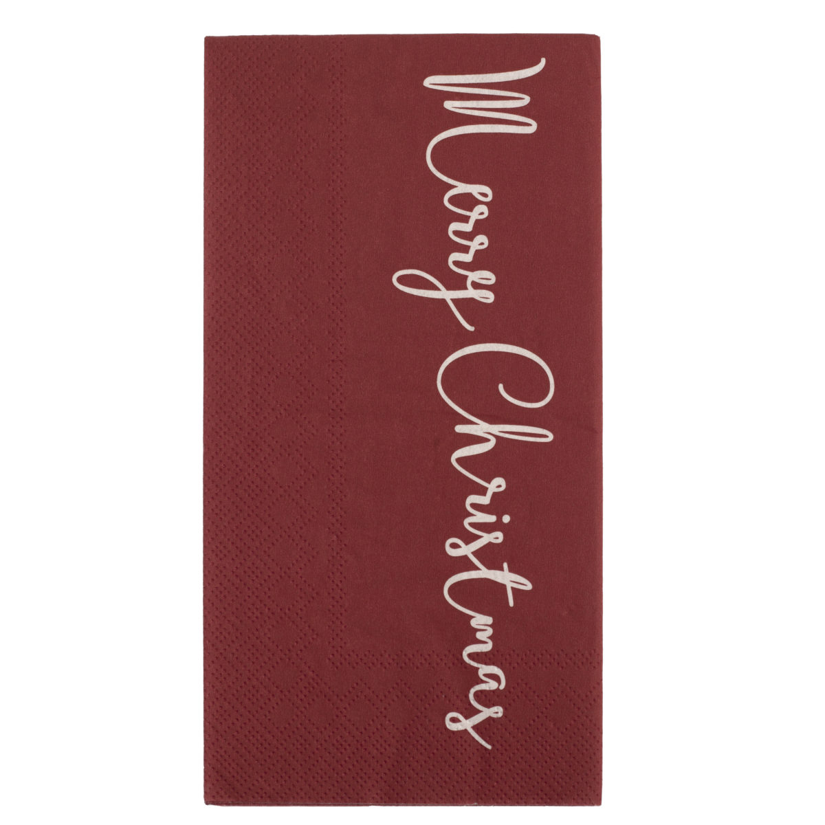 Serviett i rød julefarge med hvit skrift. Den ene siden står det GOD JUL den andre Merry Christmas.