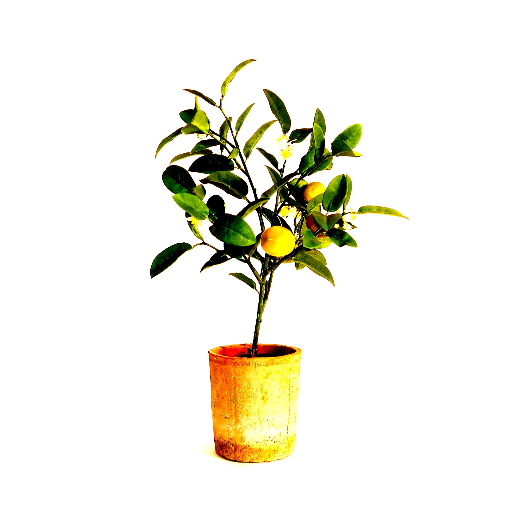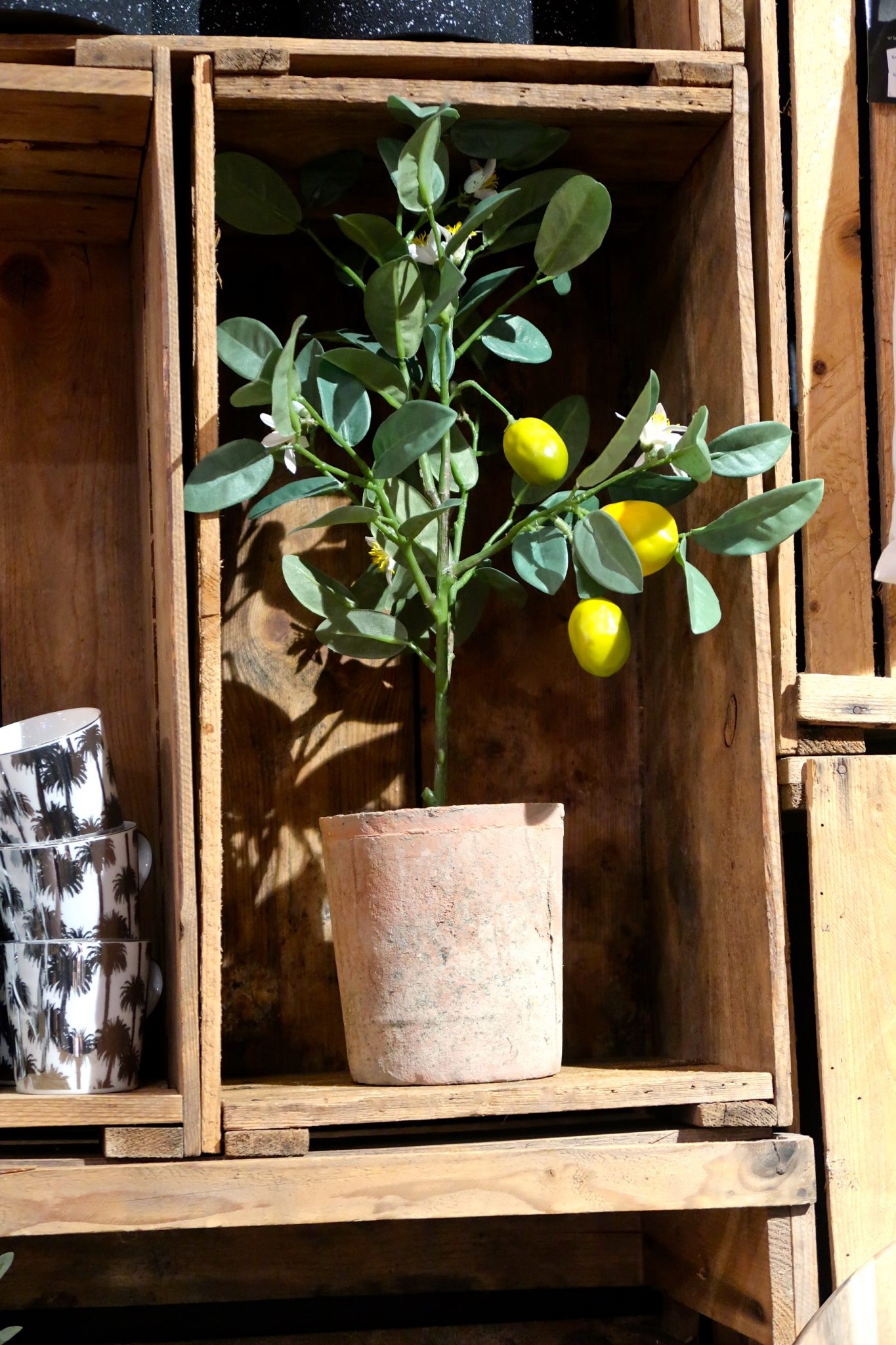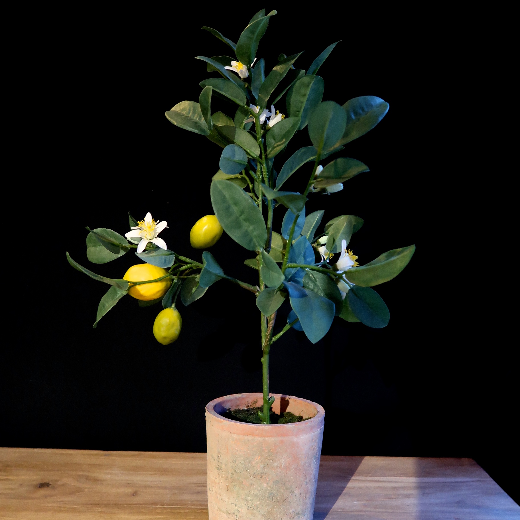 Dekorativ og et veldig naturtro sitrontre i terracottapotte.