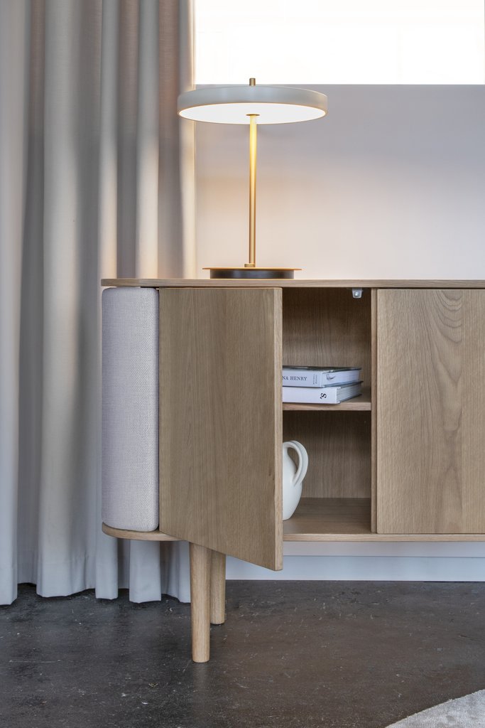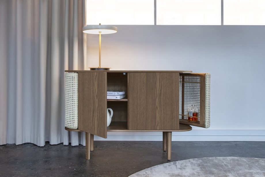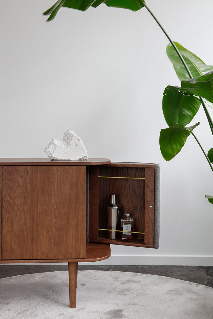 Sidene på skapet åpnes som vinger, som er perfekte som barskap, eller et lite mini bibliotek. Oppbevaringsrommene i midten av skjenken har hver en hylle, som kan justeres.